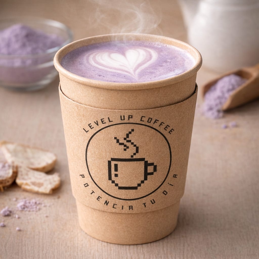 Bebida de taro con leche caliente, de sabor dulce y suave, con textura cremosa.