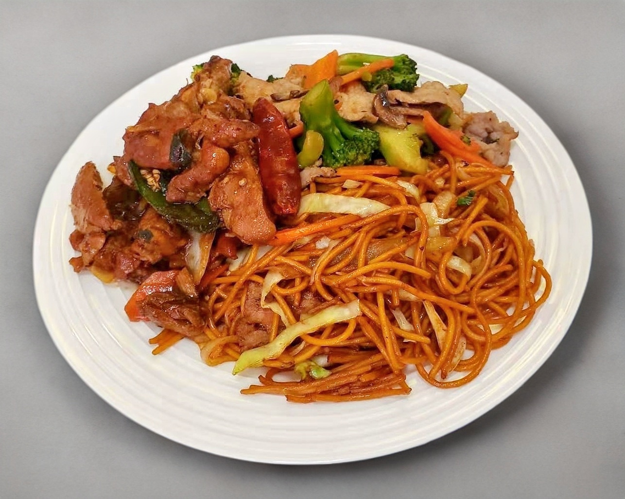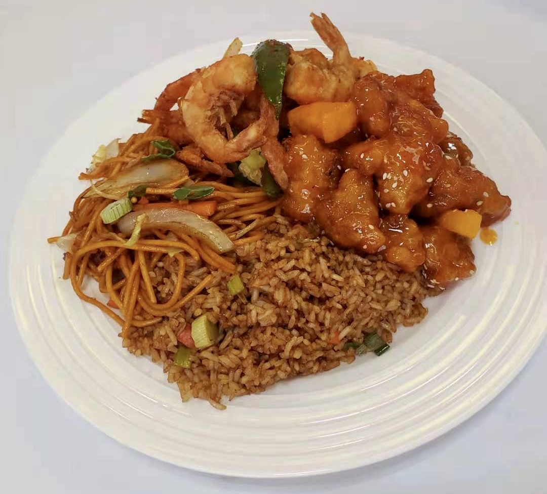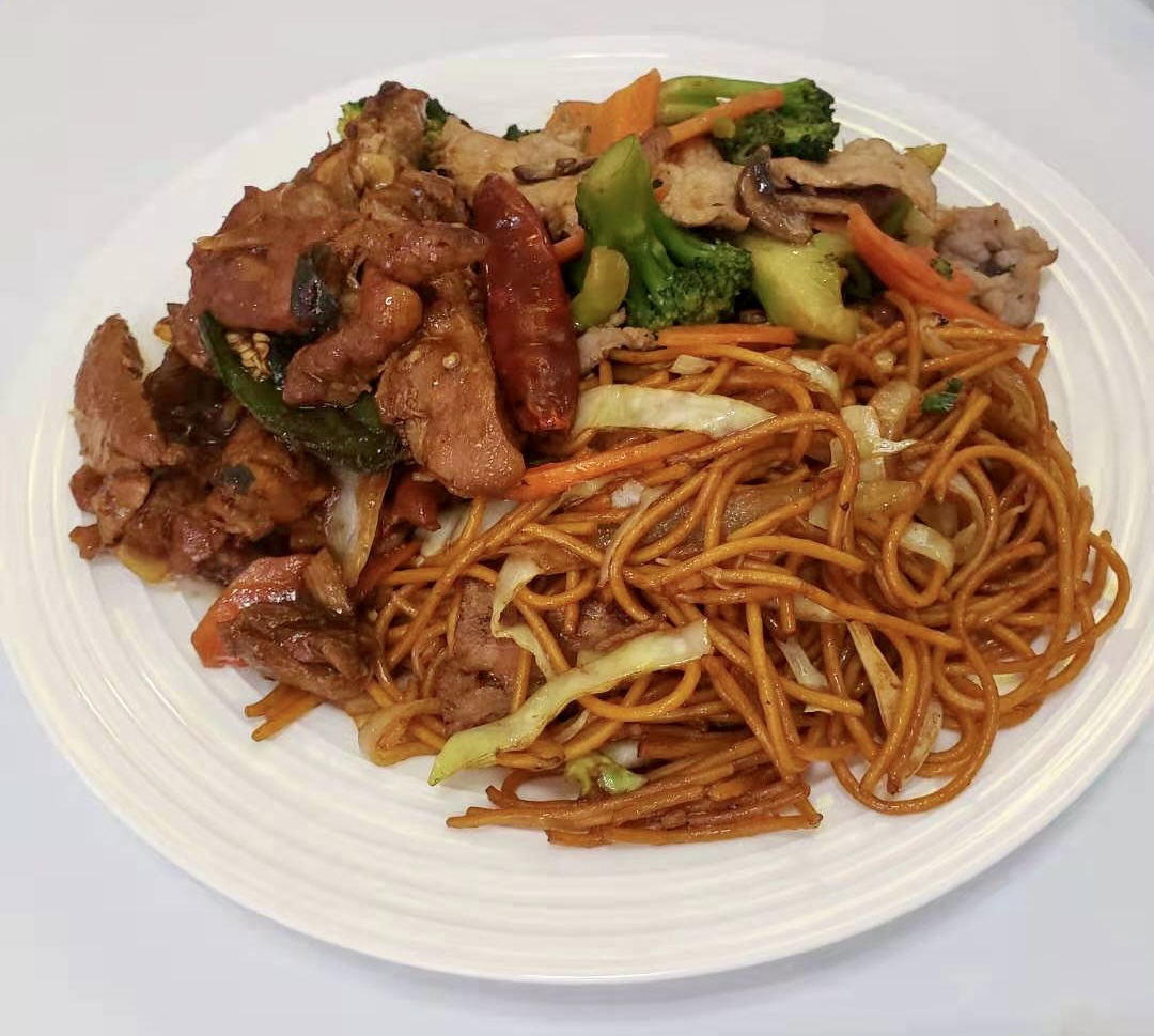 Combo individual con plato de 2 guisos, 1 rollo primavera y 1 galleta de la suerte para acompañar.