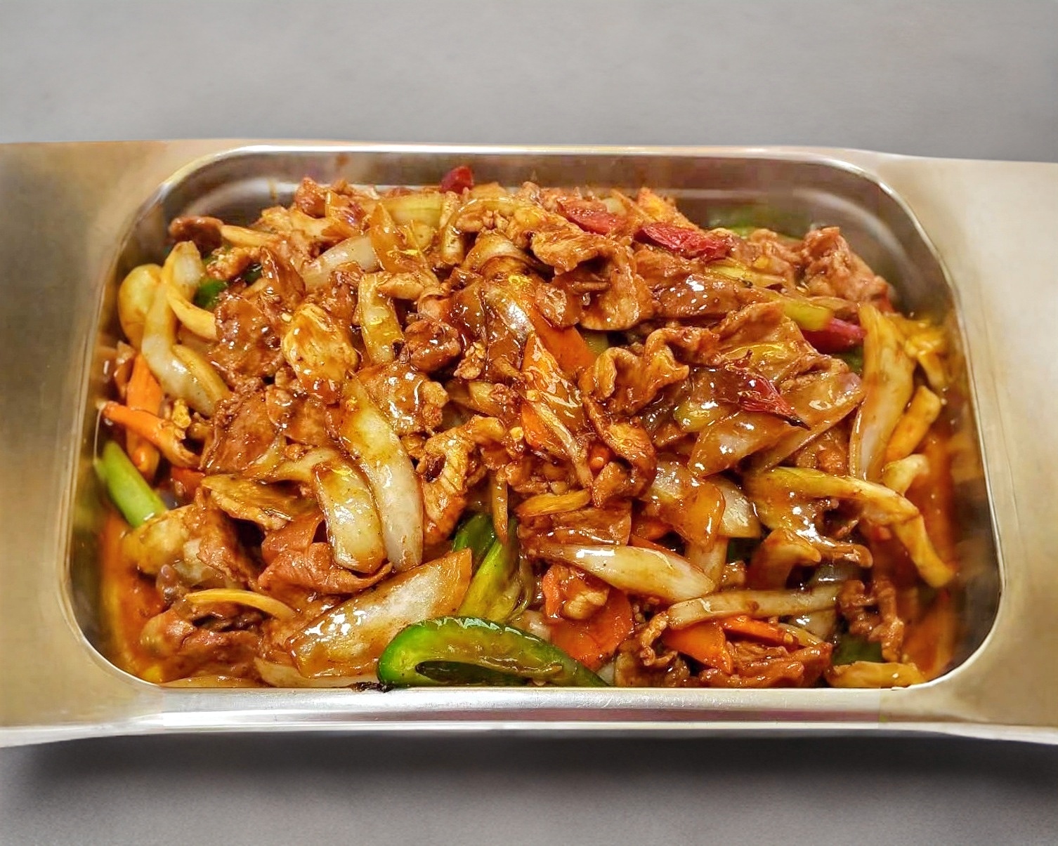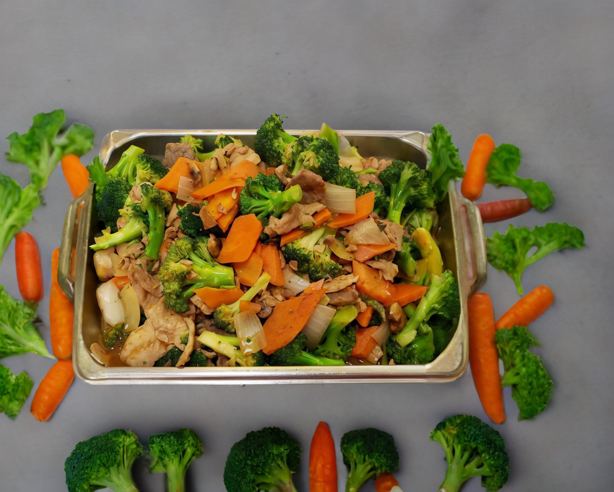 Brócoli, zanahoria y cebolla sazonados con carne de puerco y res.