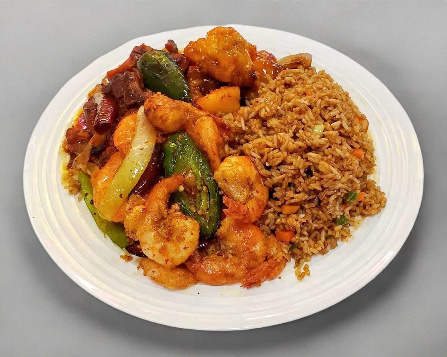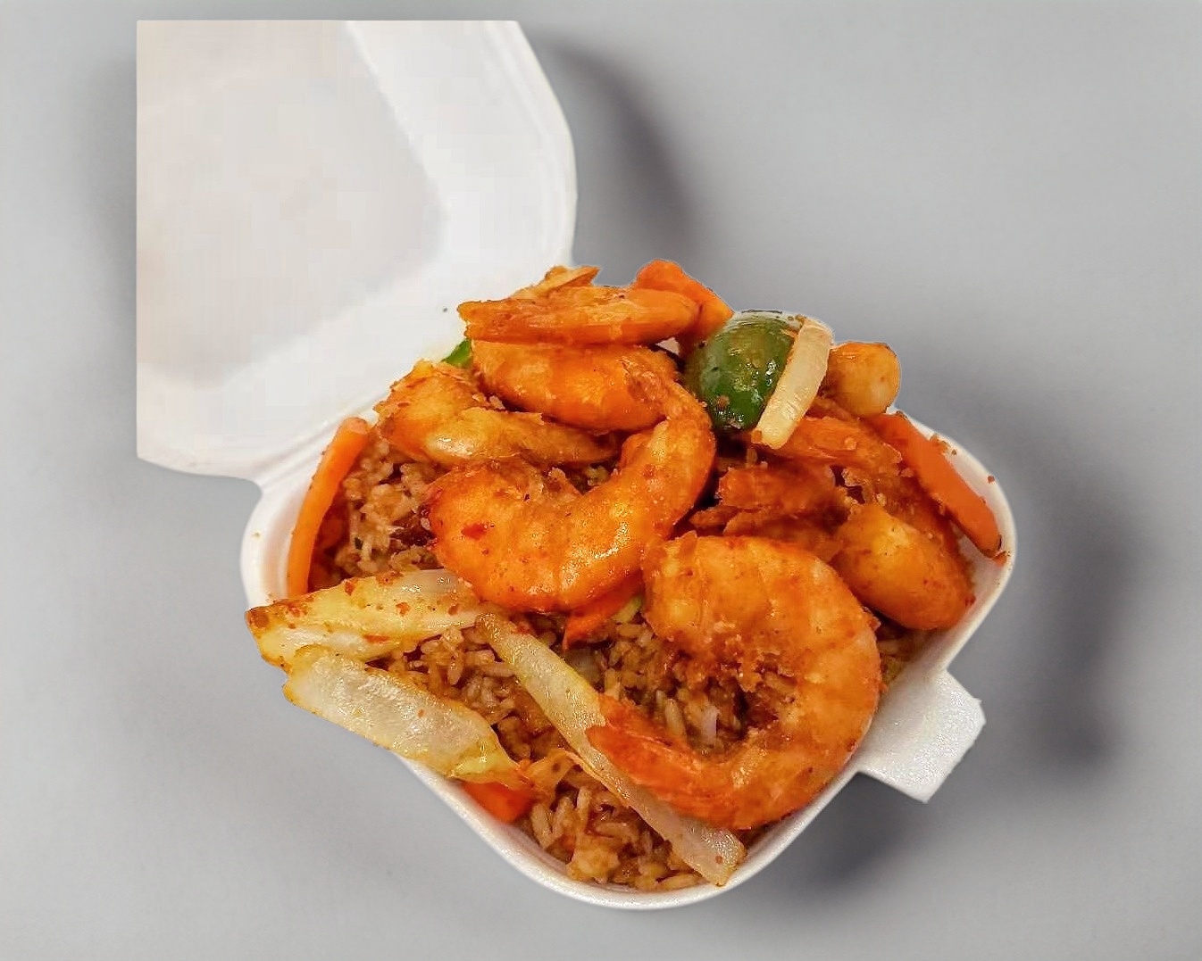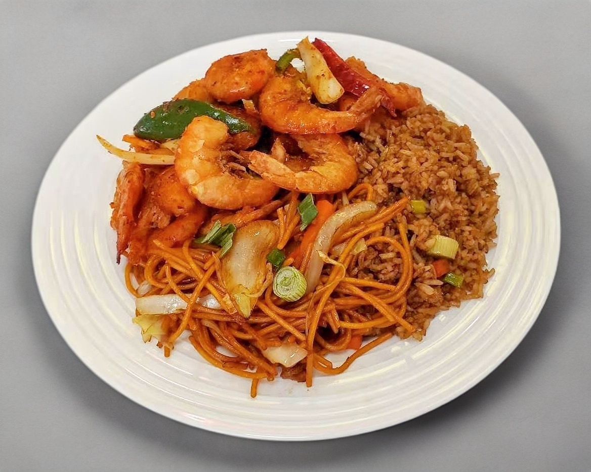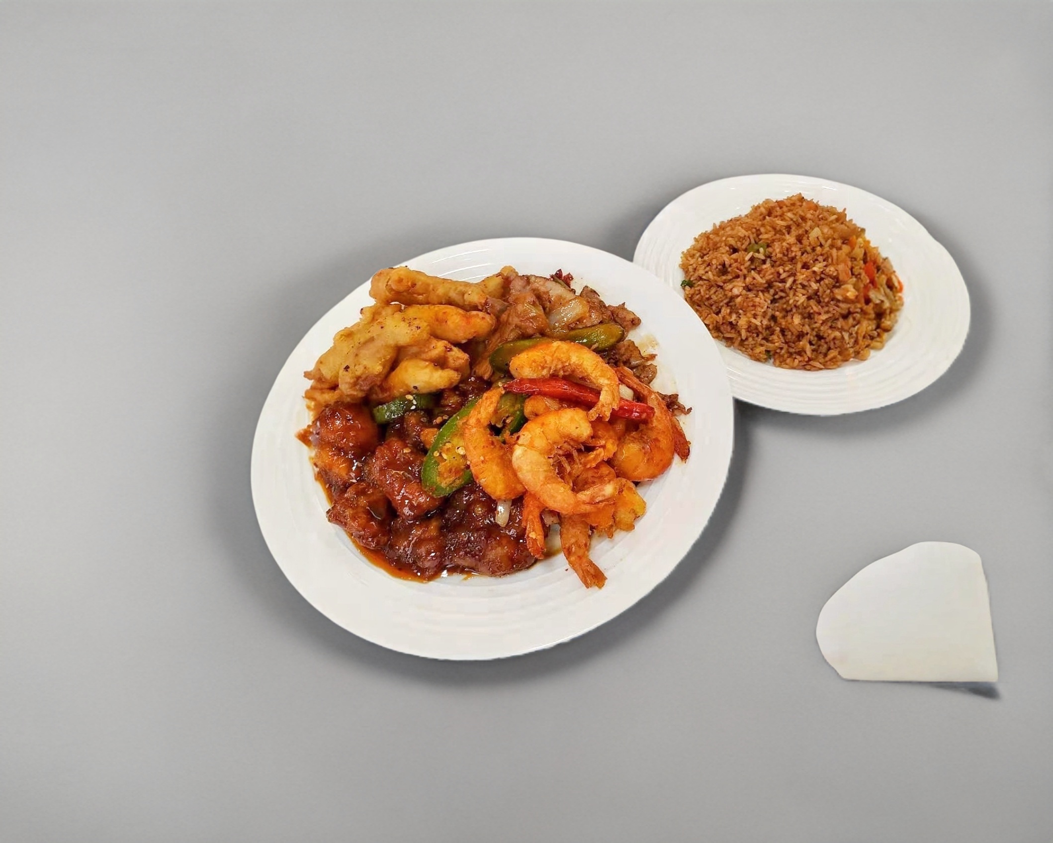 Camarón picante, acompañado de un guisado a elegir y arroz mixto. Ideal para una persona.