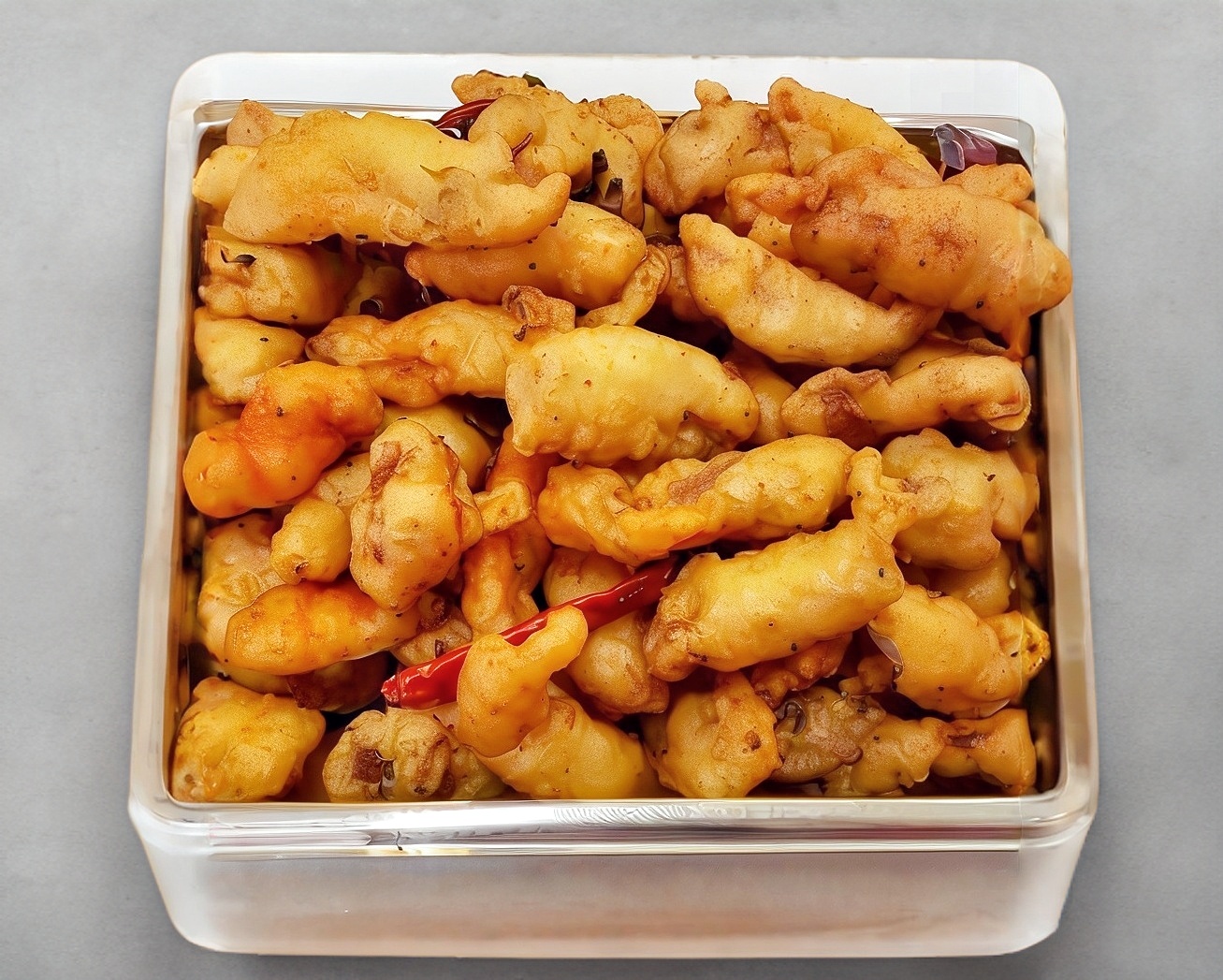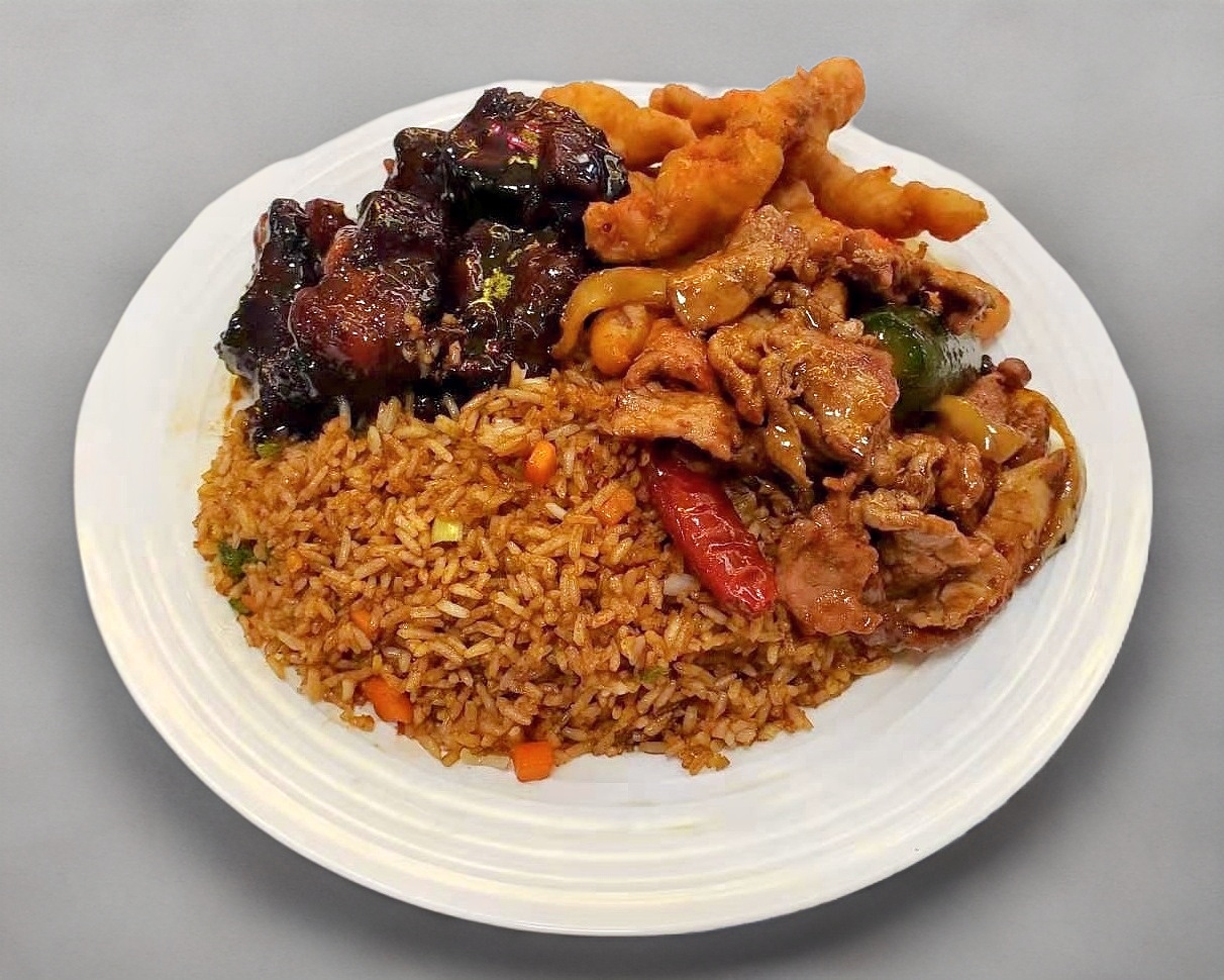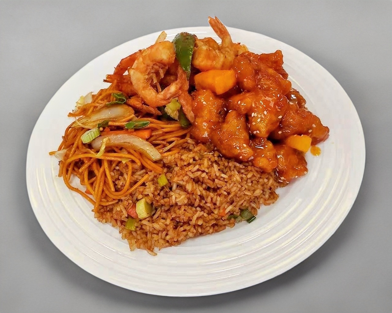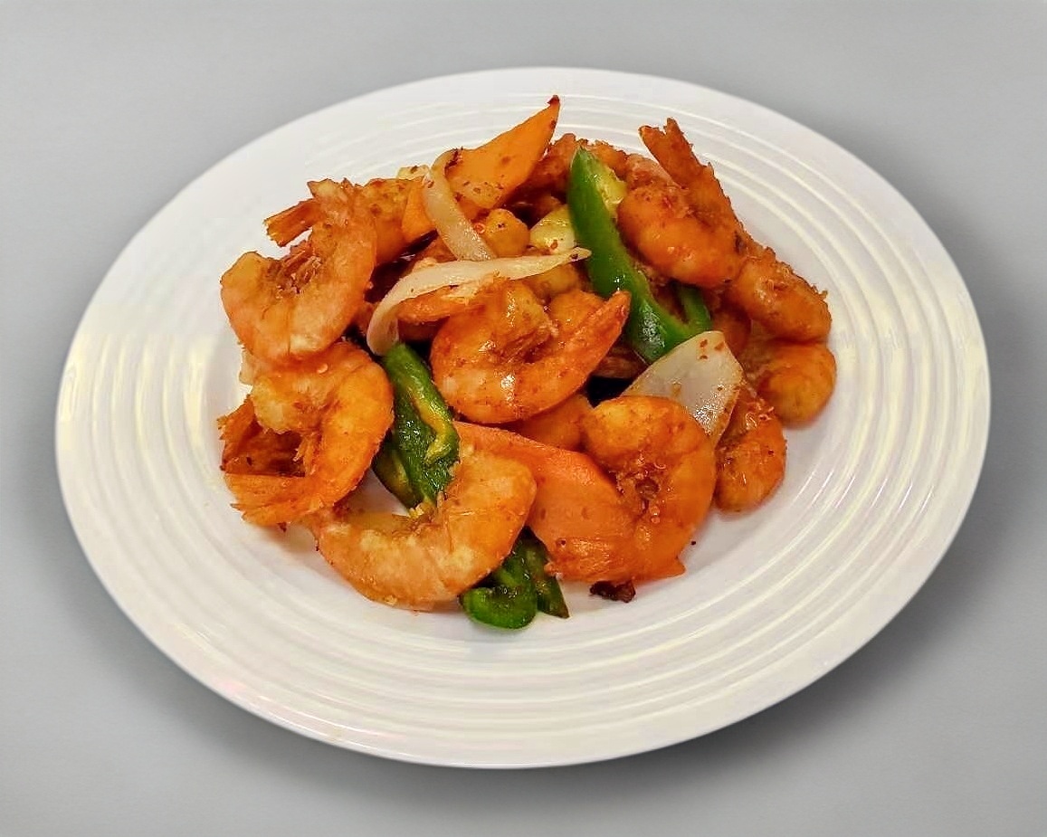 Camarón picante, acompañado de un guisado a elegir y arroz mixto. Ideal para una persona.