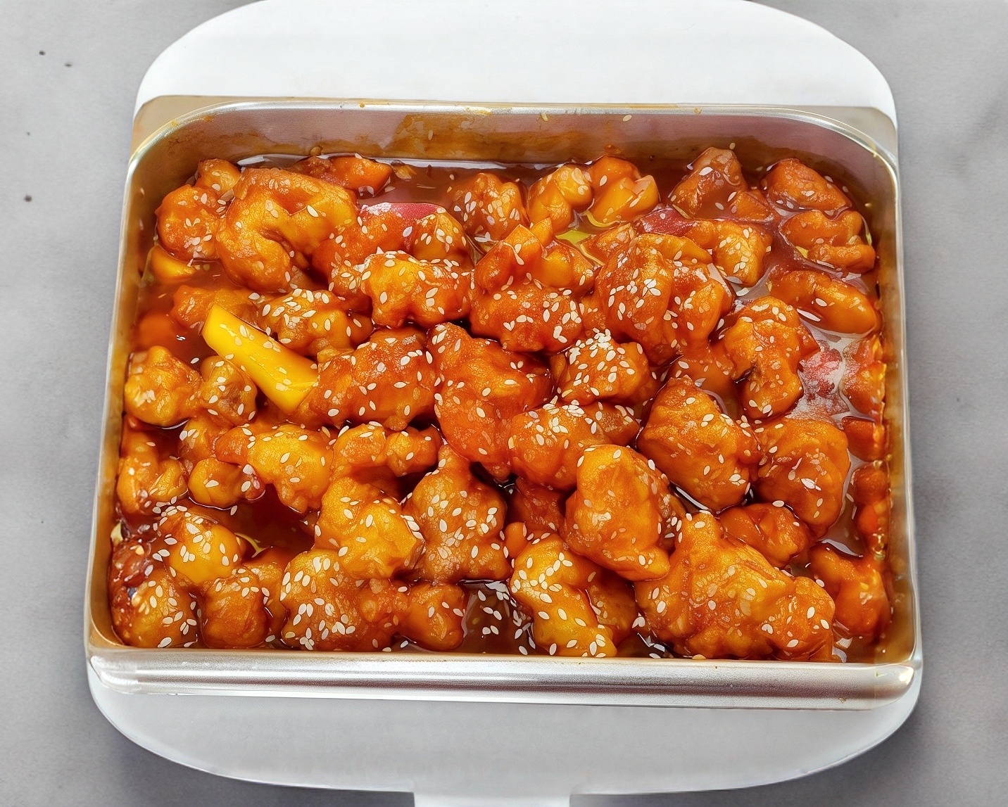 Pollo empanizado bañado en salsa agridulce.