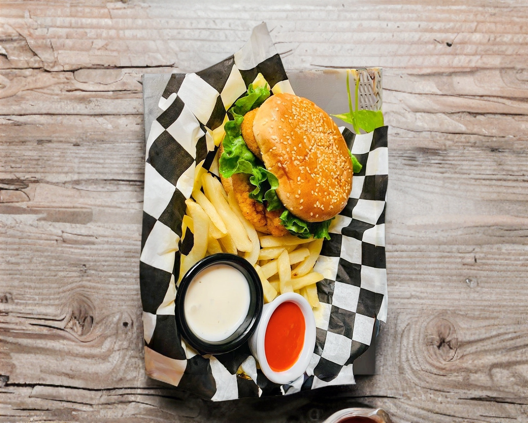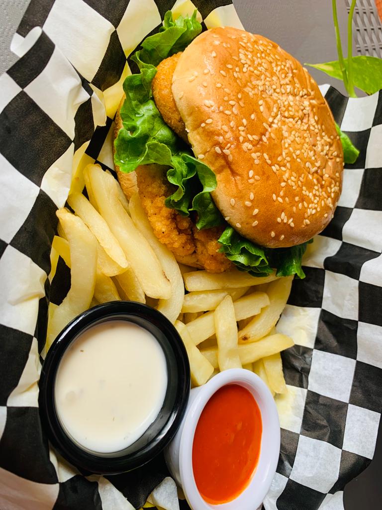 Burger con lechuga, tenders de pollo, aderezo especial y aros de cebolla acompañadas de papas a la francesa.