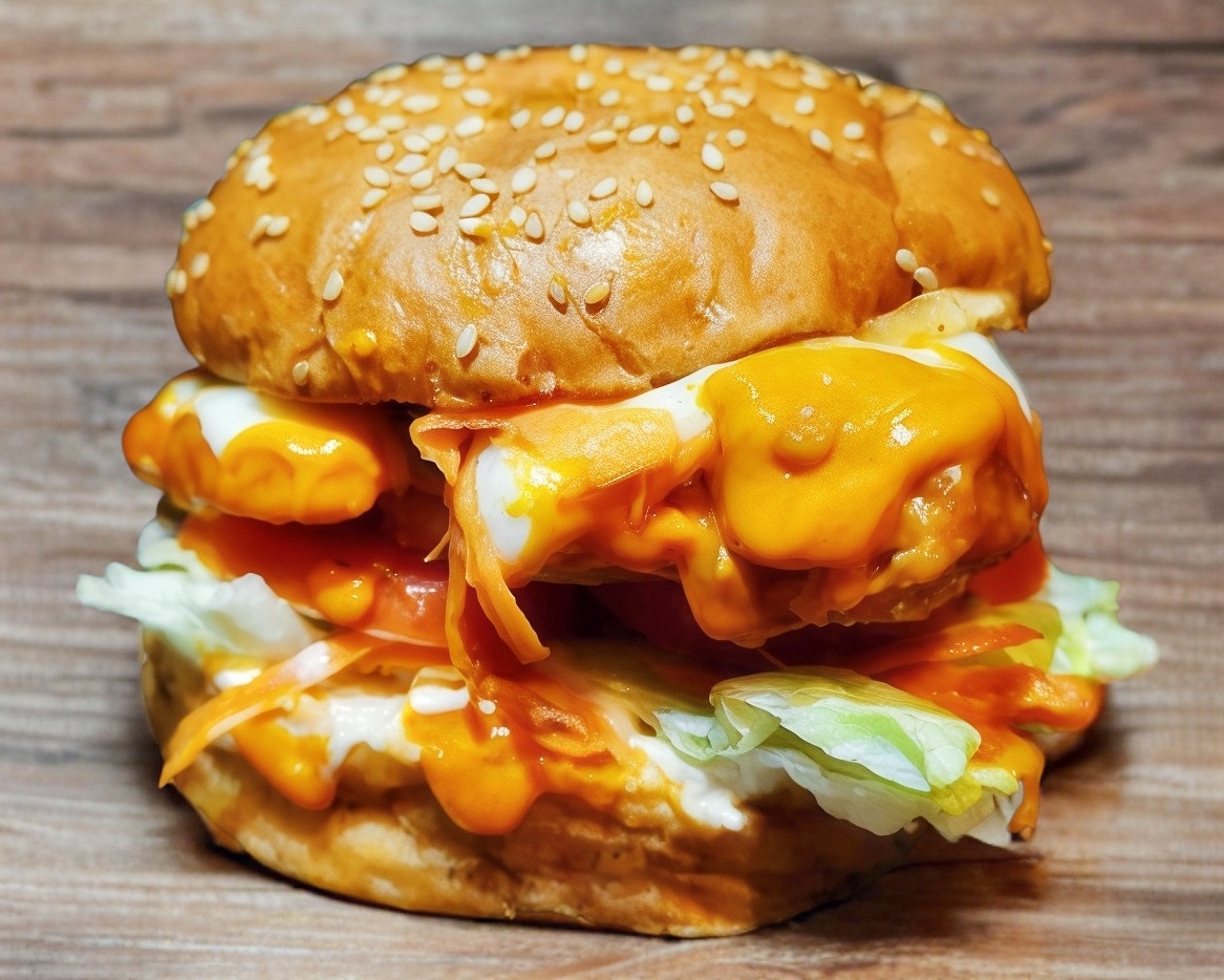Pan artesanal, pechuga de pollo empanizada, bañada en salsa buffalo de la casa, acompañada de aderezo ranch, queso manchego, zanahoria rallada, lechuga, tomate, aguacate y cebolla, acompañado de papas a la francesa