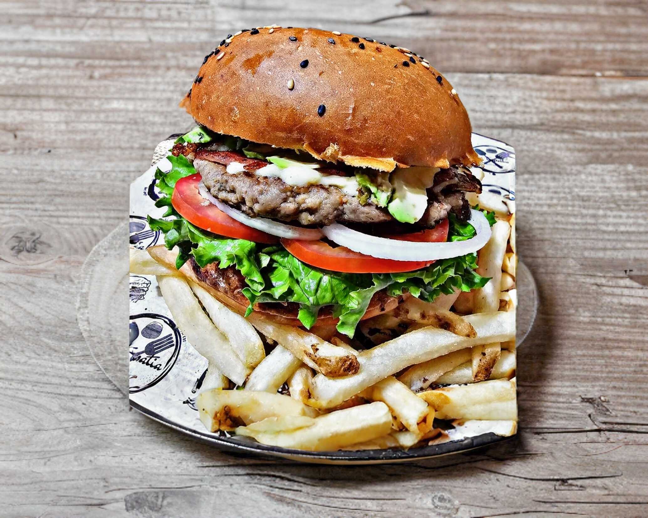 Pan artesanal, carne de res a las finas hierbas, queso manchego, jamón de pavo ahumado, mezcla de aderezos, rebanada de piña en almíbar adobada, jitomate, cebolla y aguacate, acompañado de papas a la francesa