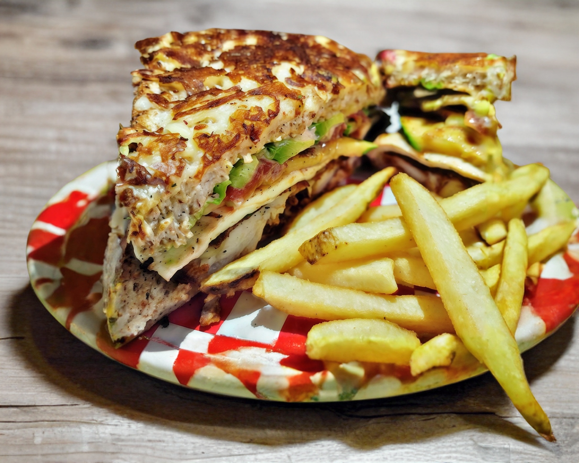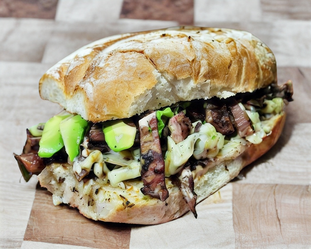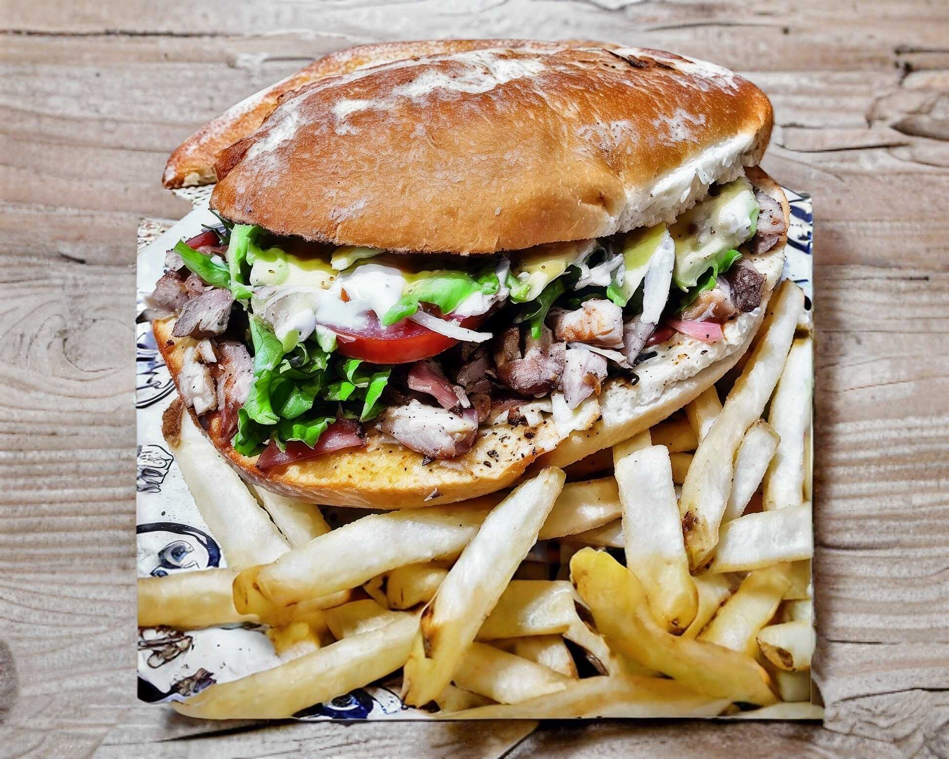 Arrachera marinada y tocino ahumado, mezcla de cebollas y pimientos salteados, queso gouda, mayochipotle, tomate y aguacate en pan tipo torreon, acompañado de papas a la francesa