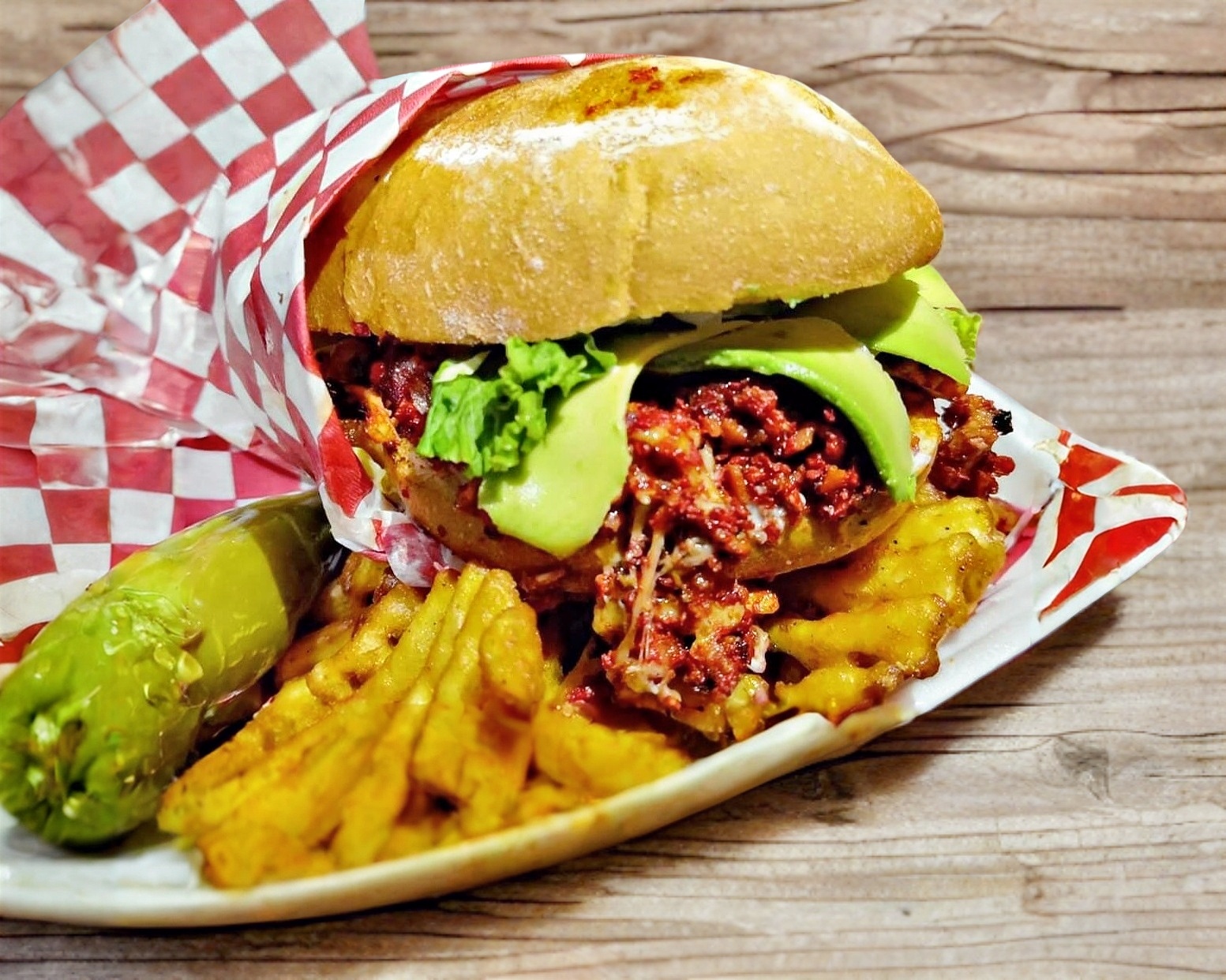 Carne de res a las finas hierbas, jamon de pavo, queso manchego, mezcla de aderezos, 2 jalapeños poopers empanizados rellenos de queso crema, tomate, lechuga y aguacate, acompañado de papas a la francesa