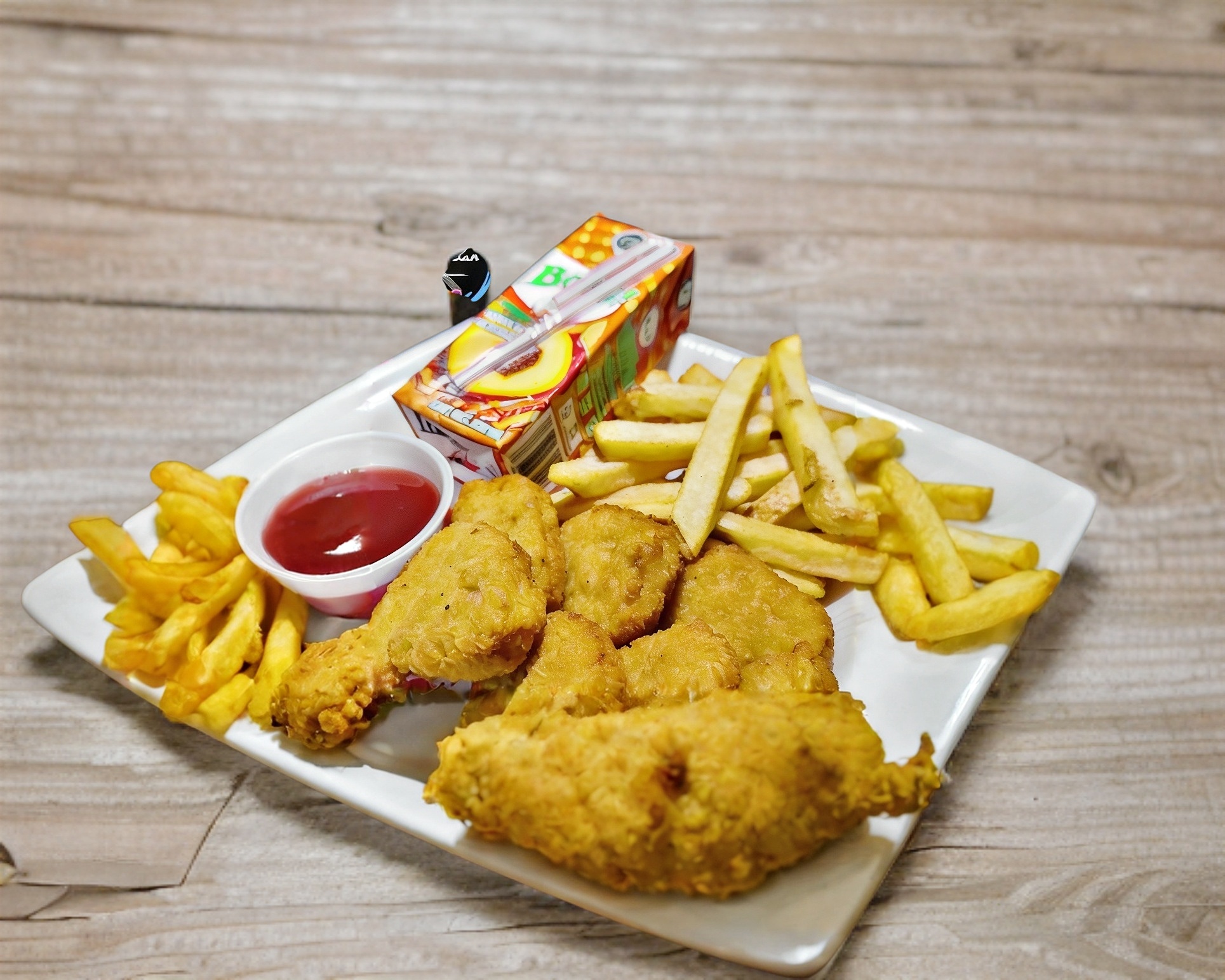 7 pz de nugget de pechuga de pollo, acompañados de papas a la francesa, catsup y un jugo de la variedad