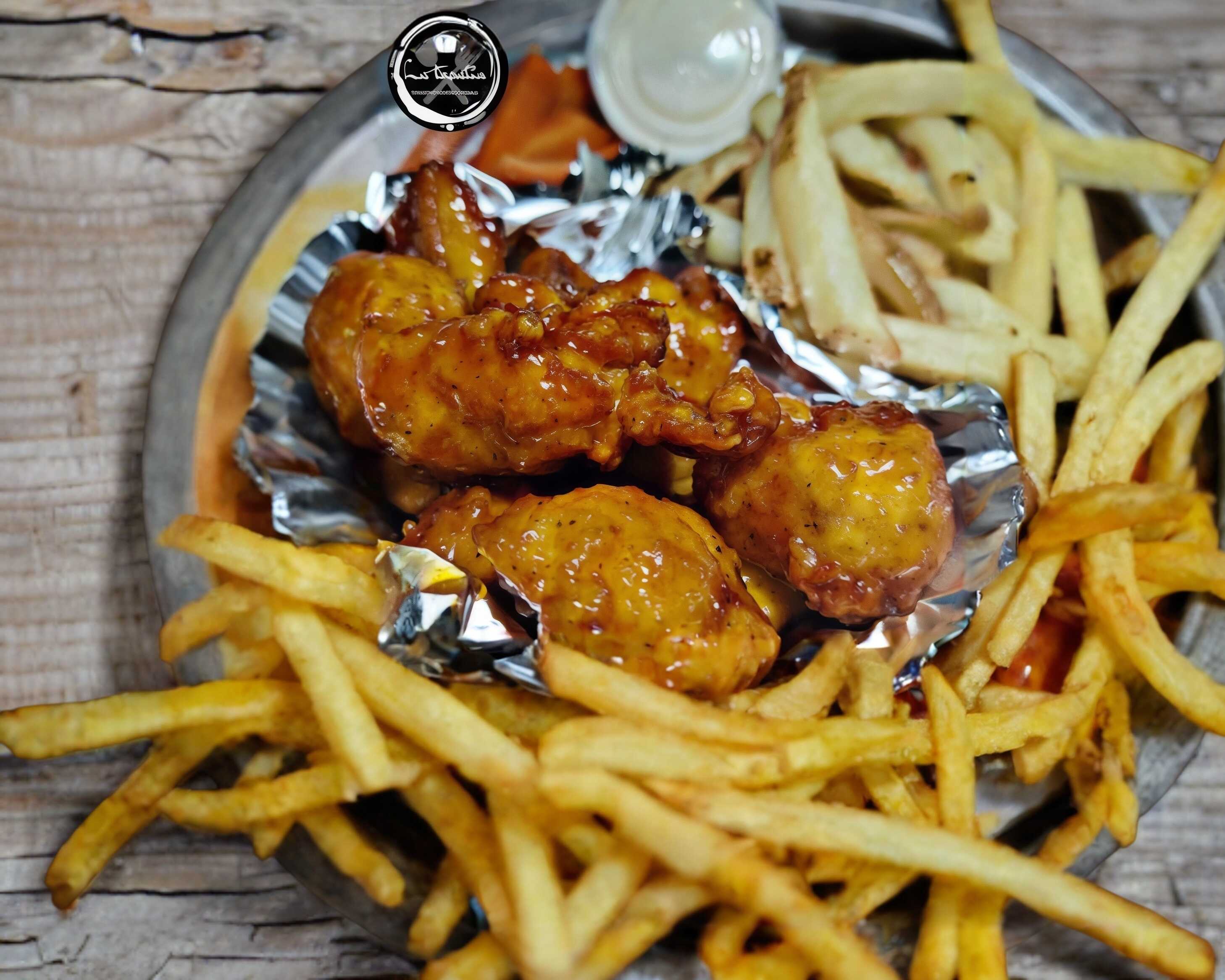 200 gms de trozos de pechuga de pollo empanizados, (8 a 10 pz) bañados en salsa a tu elección, acompañados de papas a la francesa, vegetales y aderezo ranch