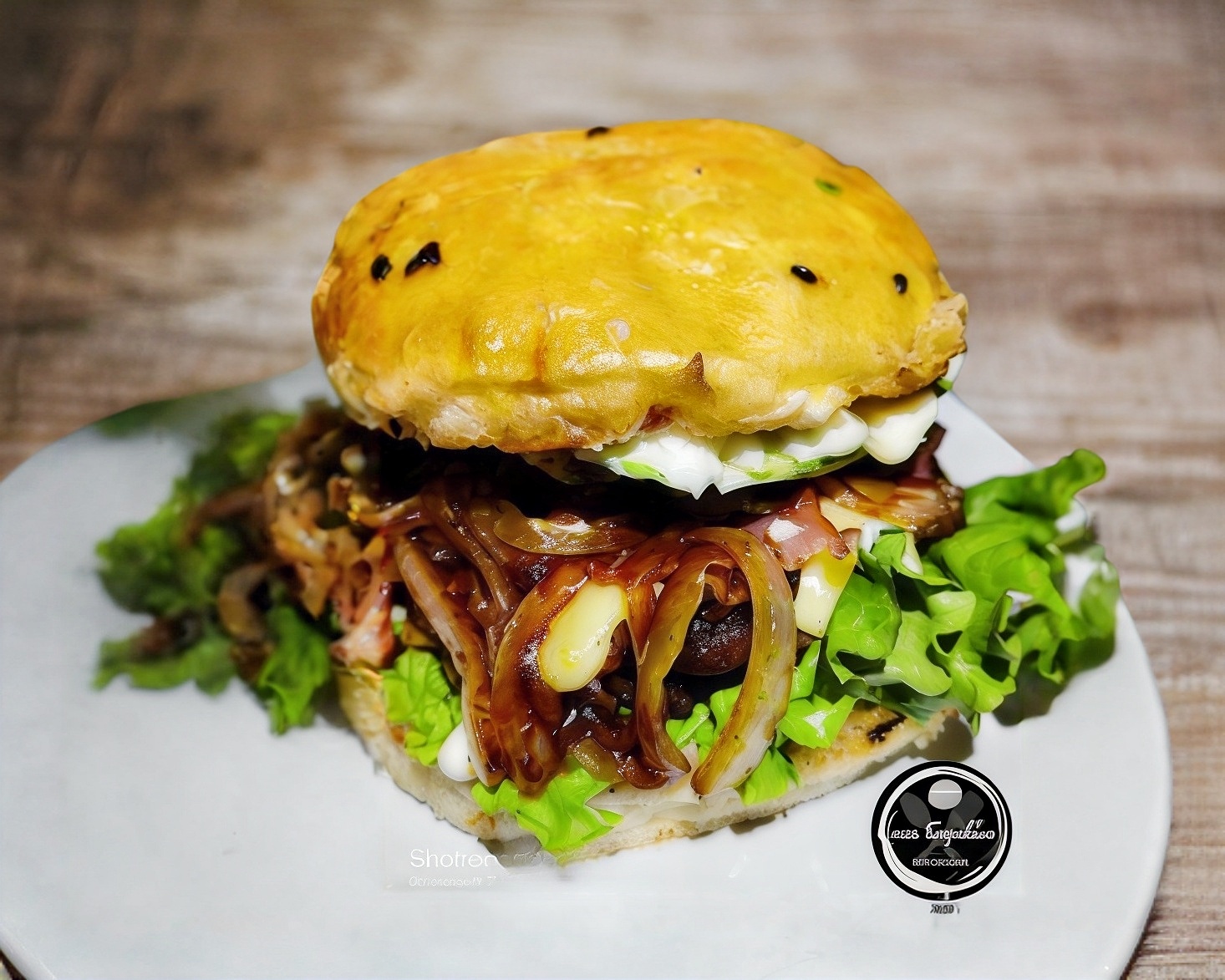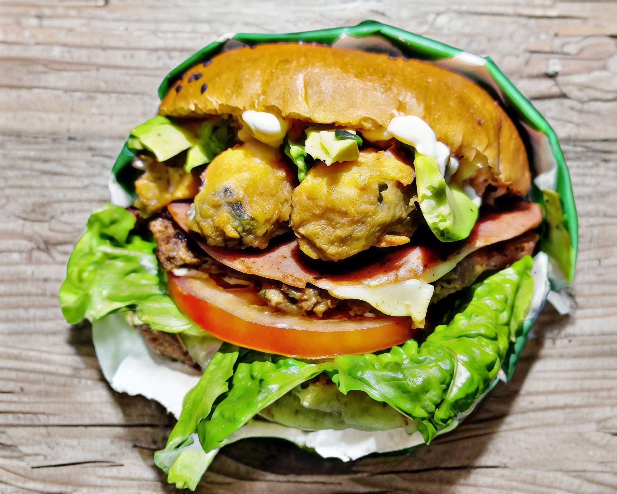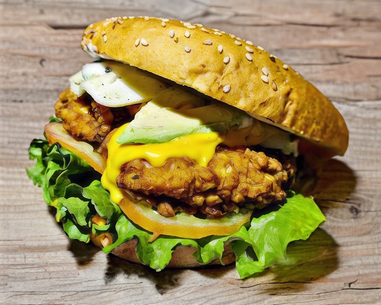 Pan artesanal, carne de res a las finas hierbas, mezcla de aderezos, queso manchego, jamón de pavo jitomate, cebolla, lechuga y aguacate ,.