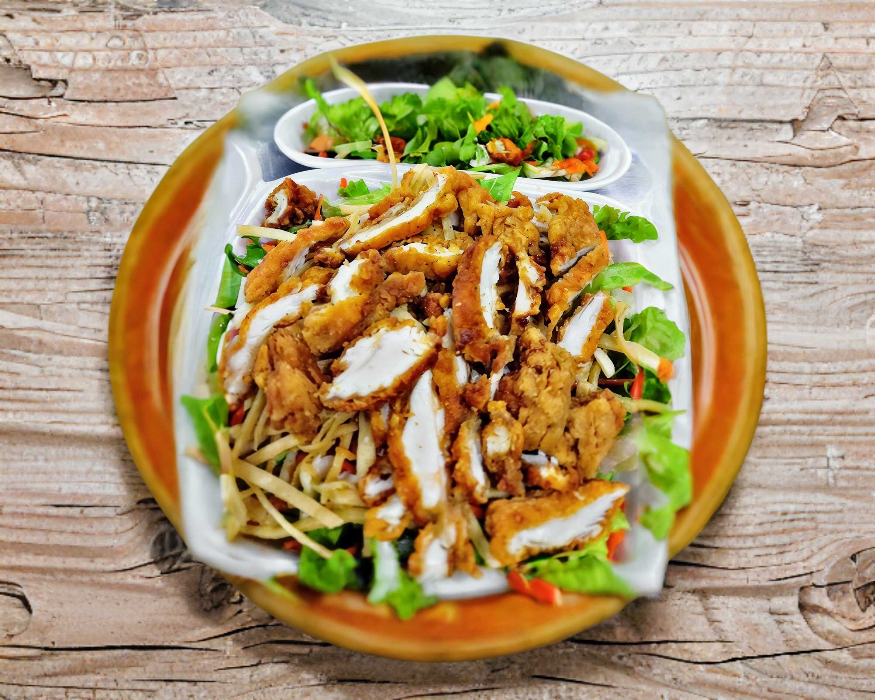 Mezcla de lechuga italiana y orejona, zanahoria rallada, tomate picado, queso mty jack, fritura de maiz crujiente, pechuga de pollo spicy bañada en aderezo ranch y salsa buffalo