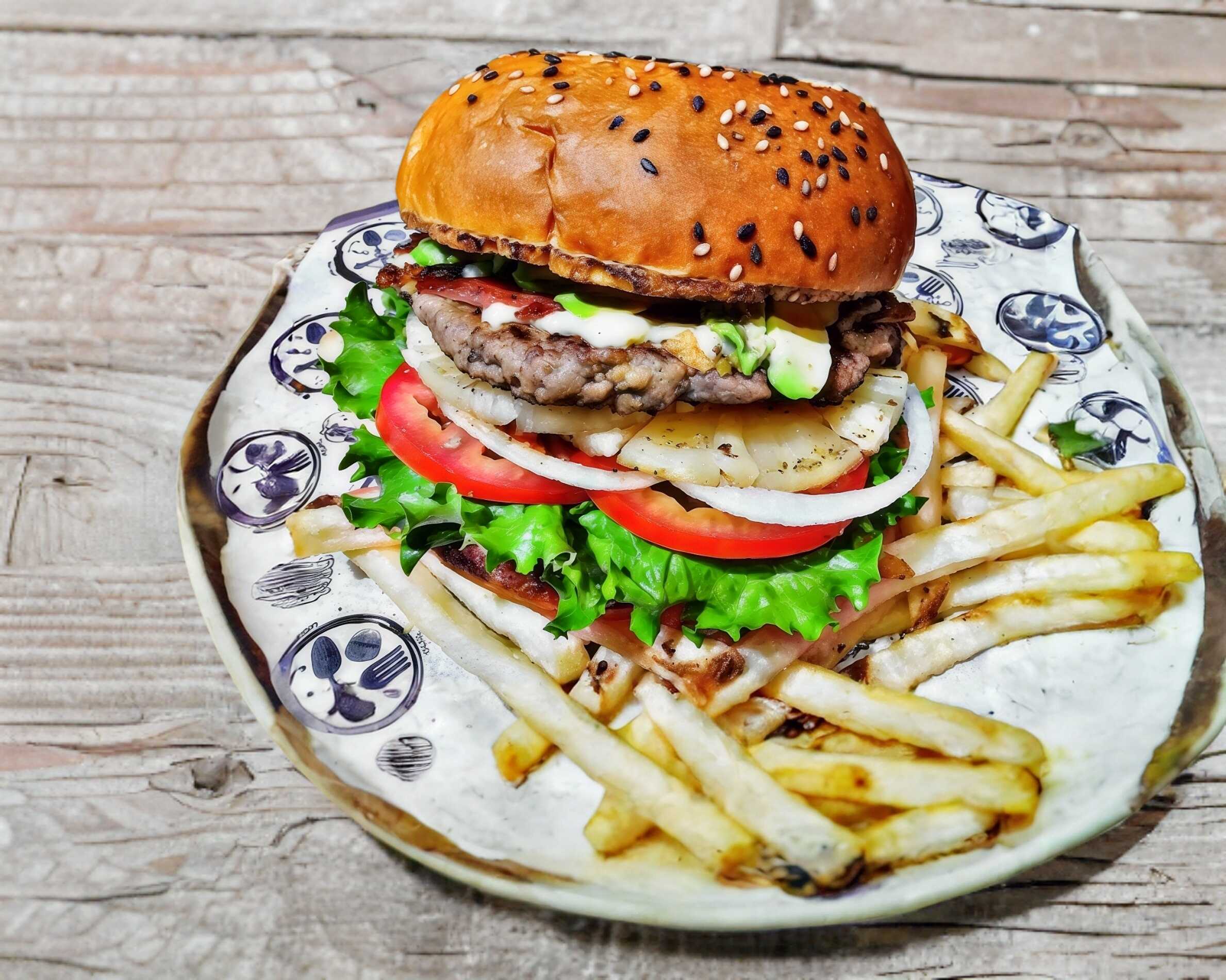 Carne de res a las finas hierbas, mezcla de aderezos, jamon de pavo, costra de quesos manchego y gouda, tocino ahumado , cebolla caramelizada, tomate, lechuga y aguacate, acompañado de papas a la francesa, acompañado de papas a la francesa