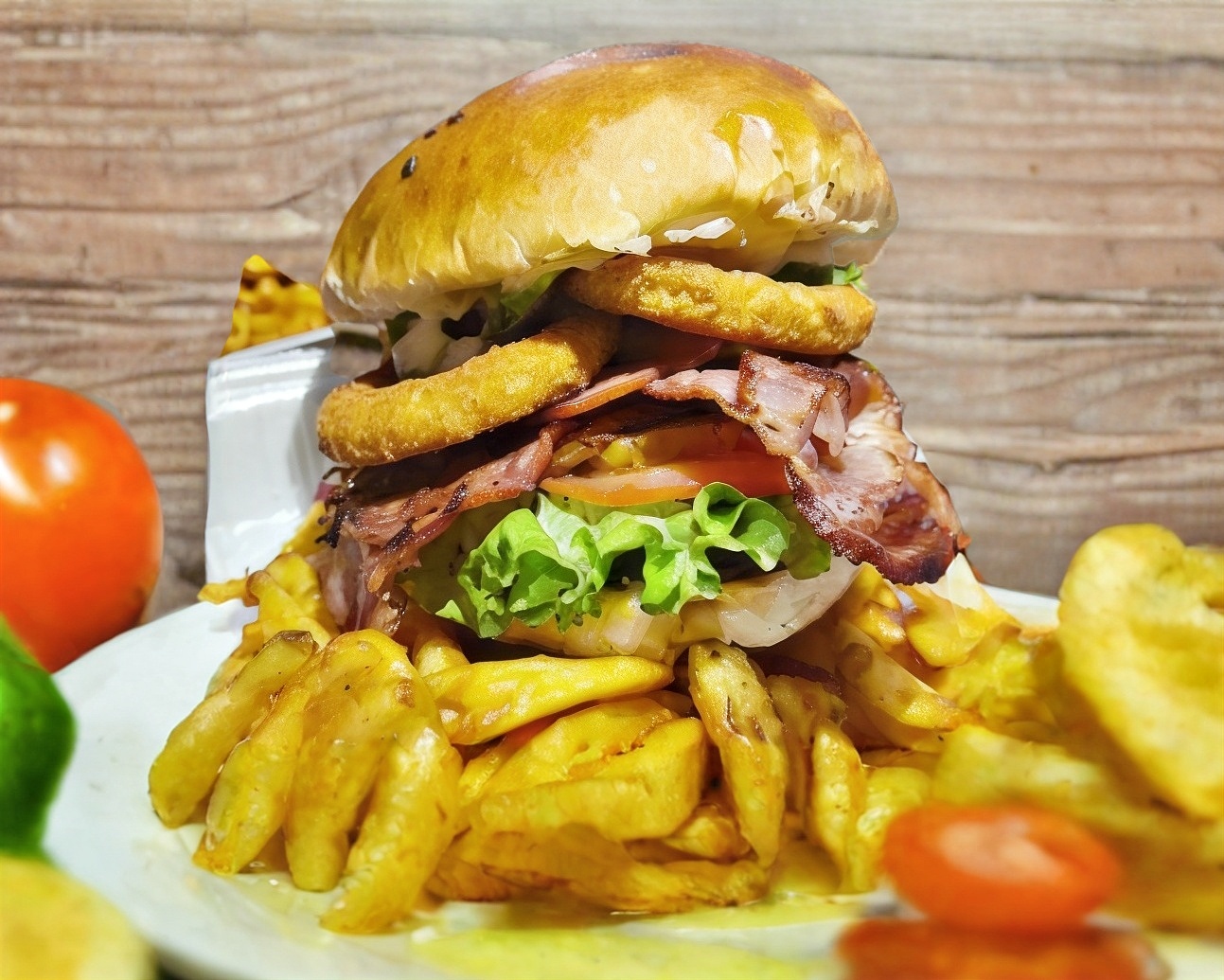 Pan artesanal, aderezo mayochipotle, queso crema , queso manchego jamon de pavo, carne de res a las finas hierbas, aros de cebolla empanizado, tomate salteado con adobo de chiles secos, lechuga y aguacate, acompañado de papas a la francesa