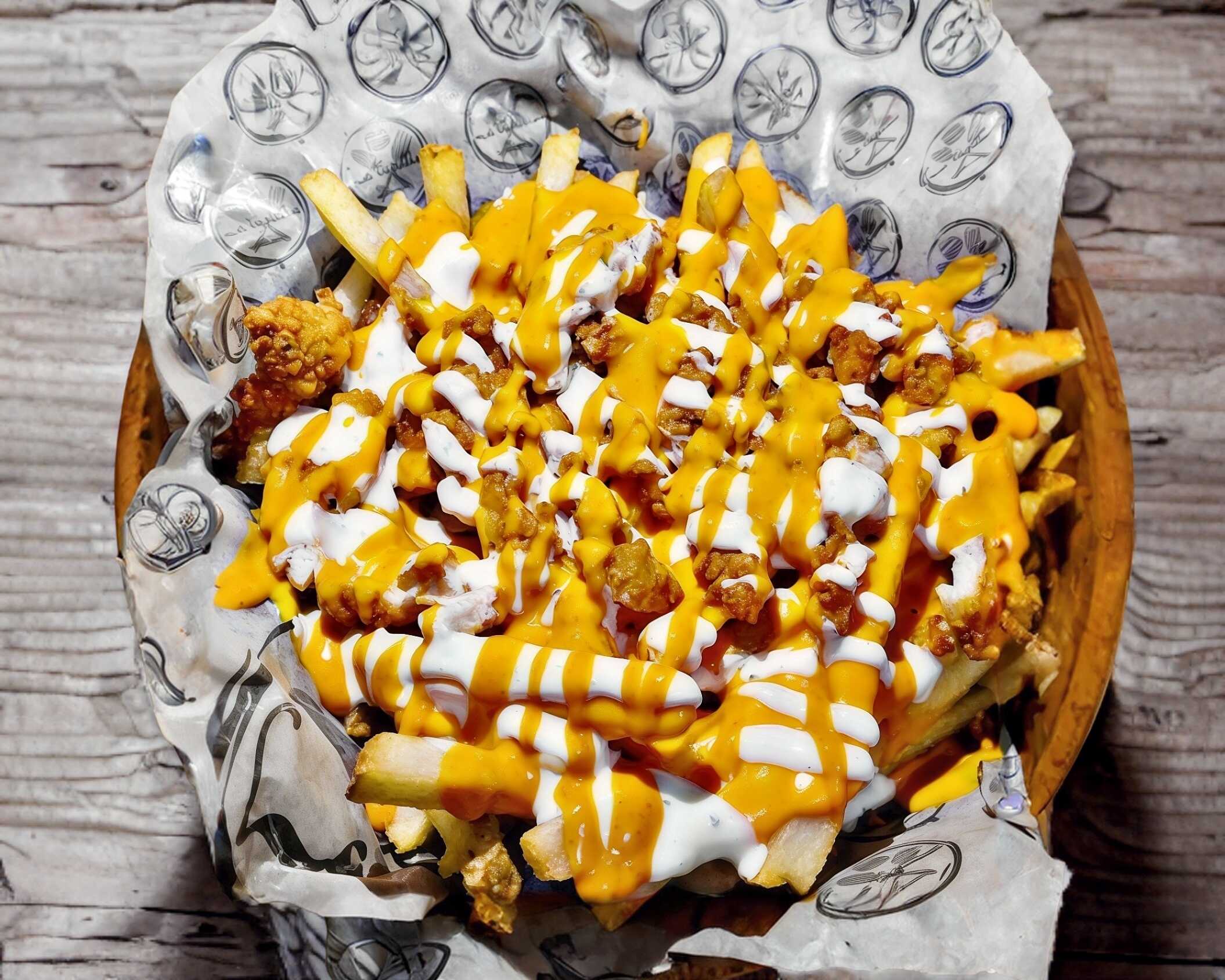 350 gms de papas a la francesa bien doradas, con una mezcla de quesos gouda y cheddar, 180 gms de fajita de pollo empanizado bañado en salsa buffalo y aderezo ranch