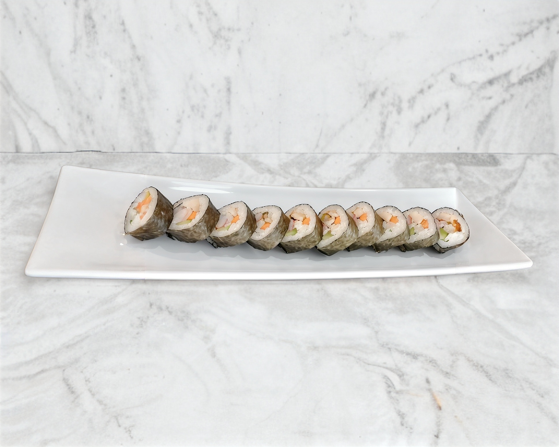 Rollo de sushi relleno de camarón, pepino, zanahoria, queso y pollo