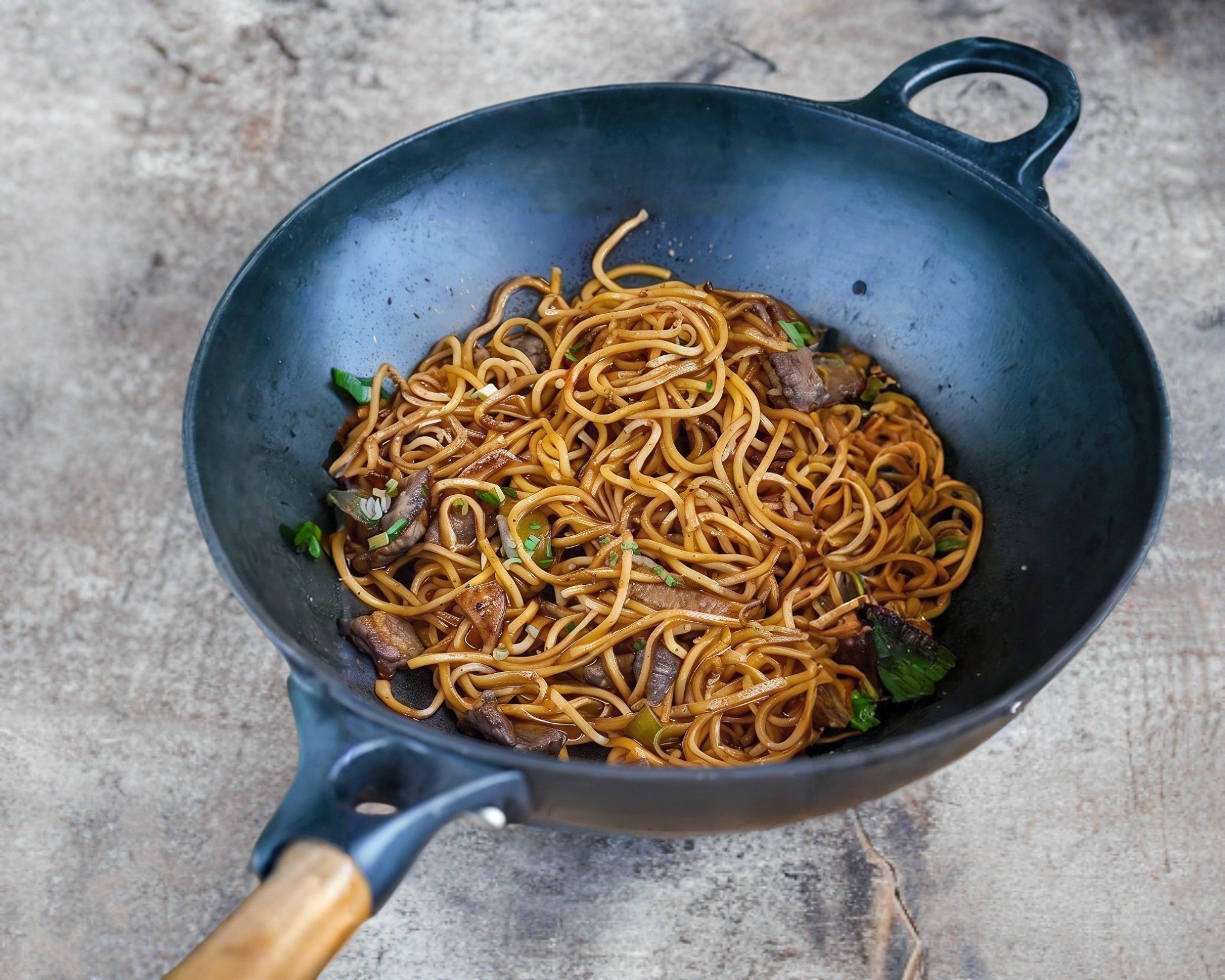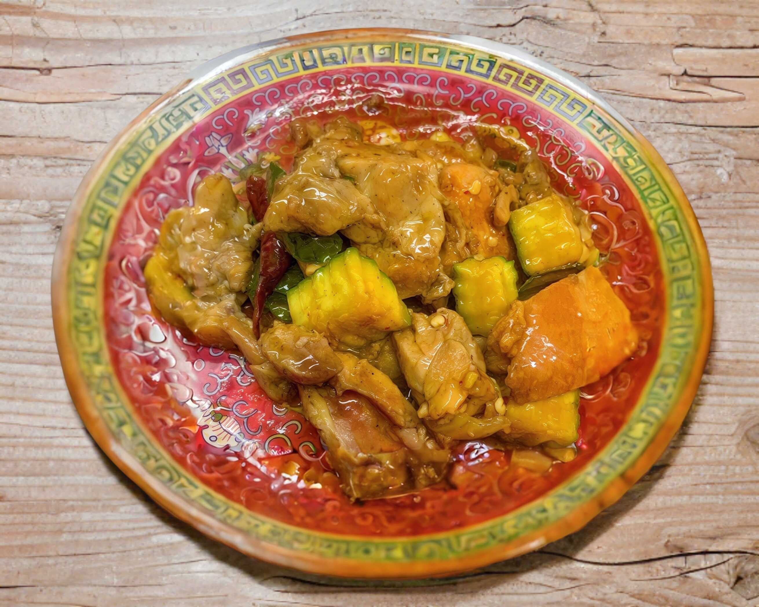 Tortilla de harina frita con repollo y trozos de pollo.