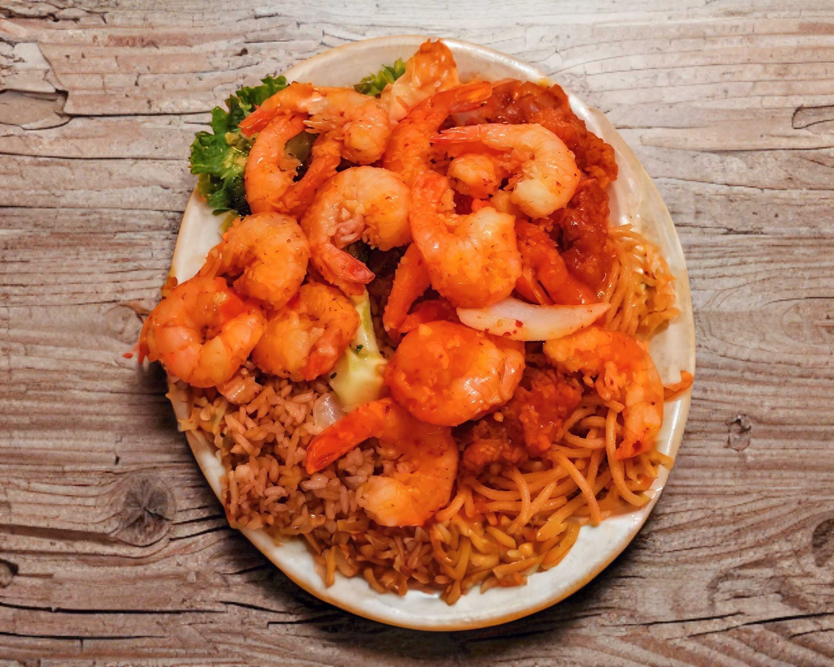 Arroz o pasta con dos guisos diferentes y camarón (400 g aproximadamente entre los guisos y 12 piezas de camarón), (para máximo 2 personas).