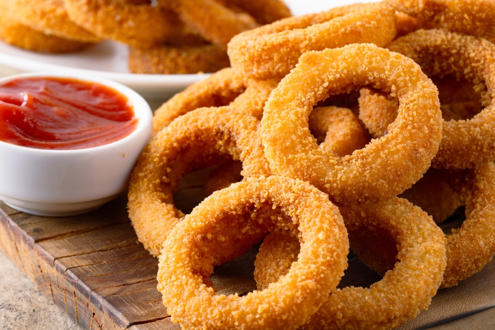 Deliciosos aros de cebolla preformados fritos en su punto.