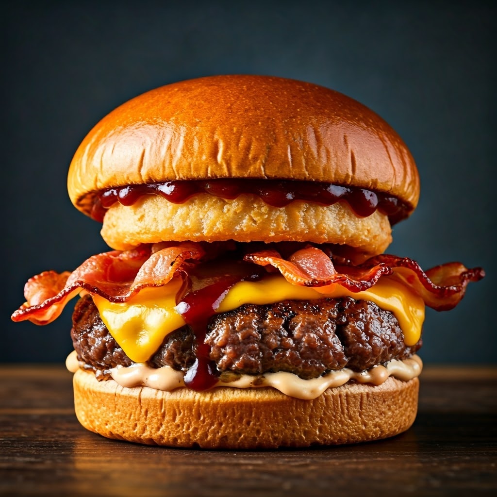 Deliciosa carne de 100 gramos, pan tipo brioche, con tocineta de cerdo y salsa barbecue hot, y aros de cebolla.