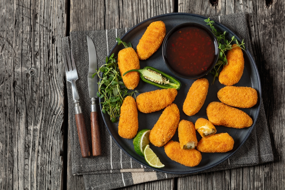 4 Piezas, chiles jalapeños empanizados, rellenos de queso crema y fritos.