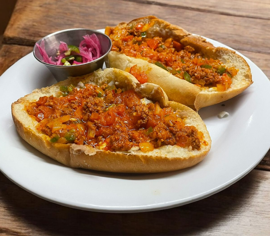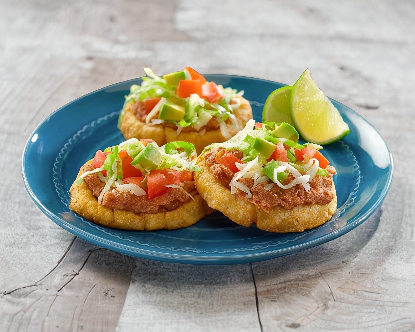 Con frijoles refritos, queso gratinado, cubierto con chorizo a la mexicana