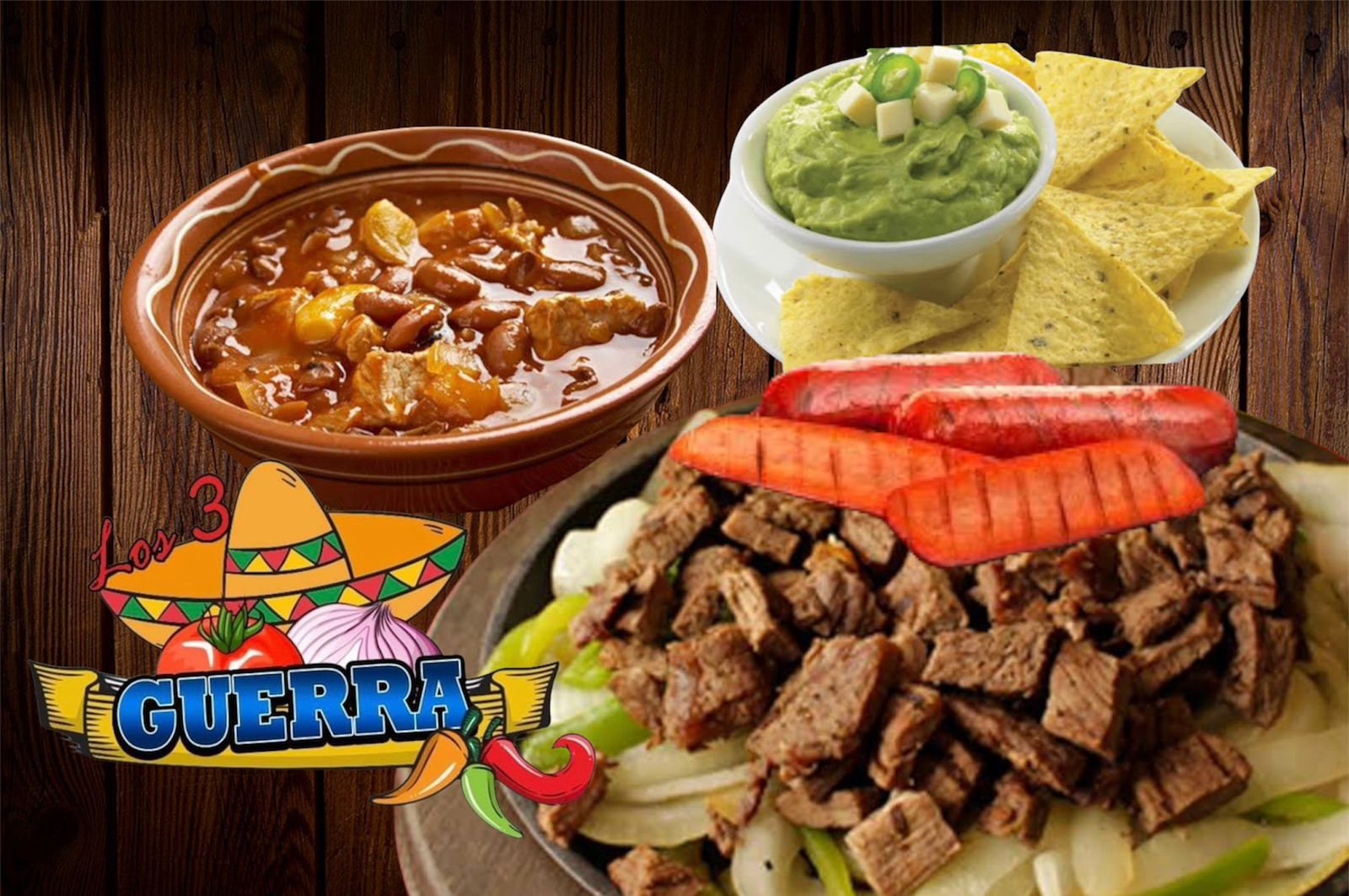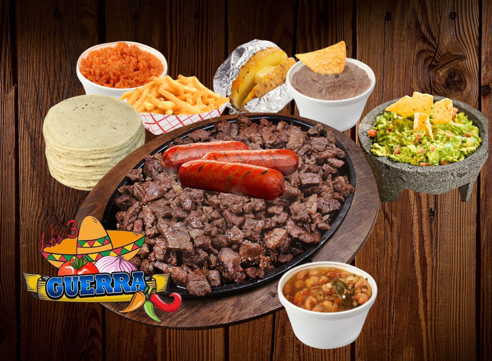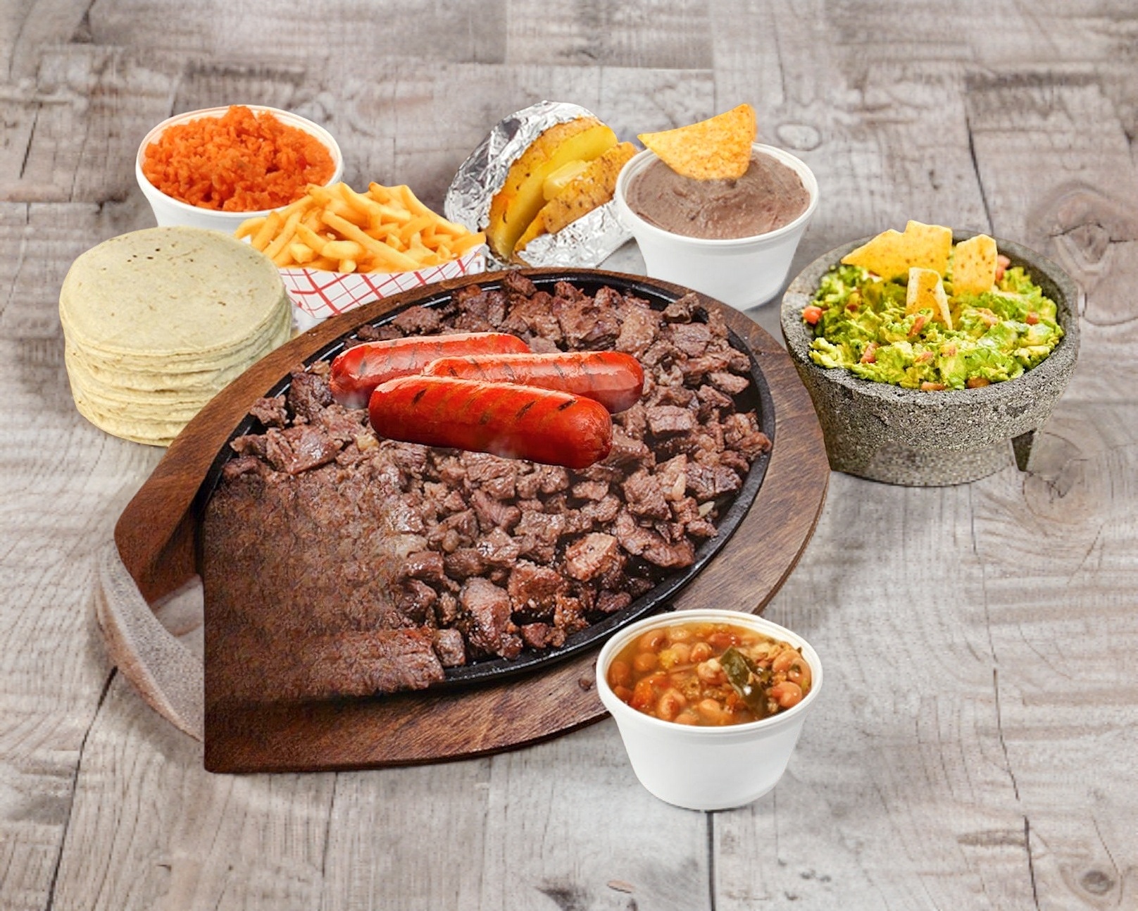 1 KG de sirloin, Queso flameado, Guacamole, Arroz, 2 frijoles charros, Totopos, Salsa, Tortillas, Cebolla Asada y Salchicha.