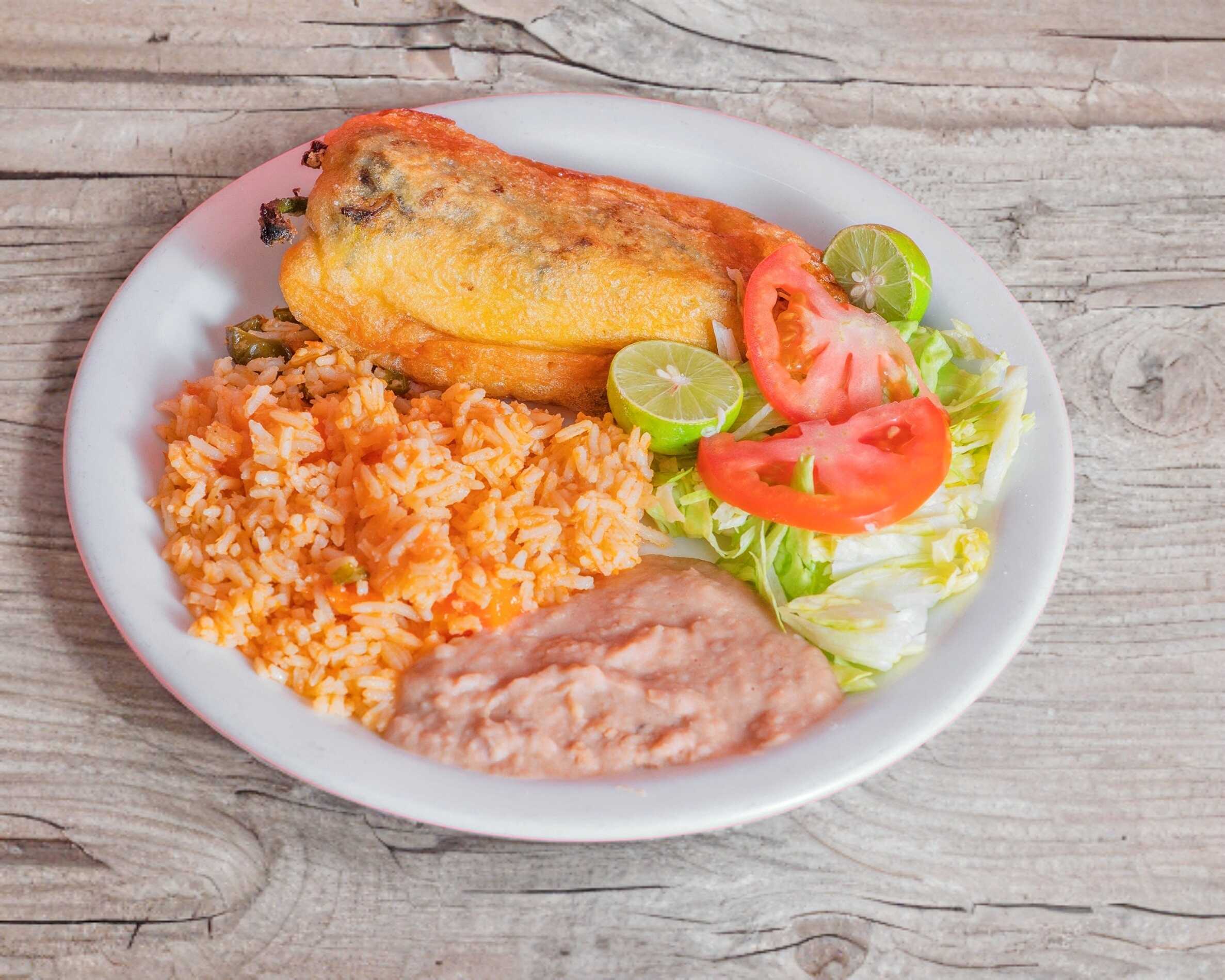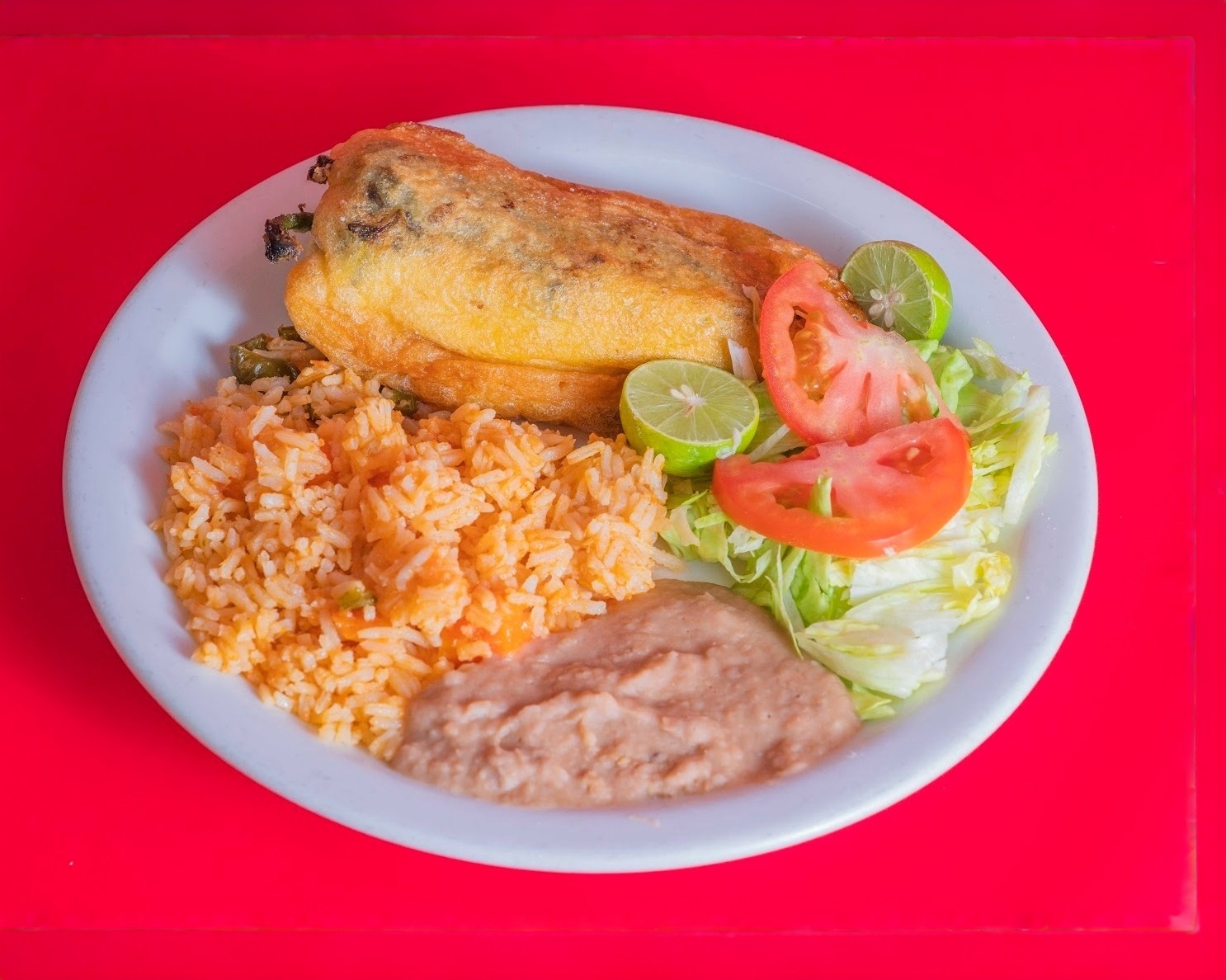 Rellena con jamón, queso amarillo. Se sirve con frijoles refrito