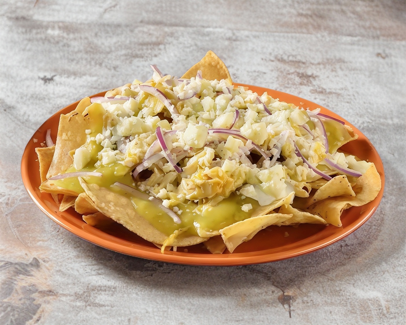 Totopos crujientes bañada en salsa con queso panela y crema. Se sirve con frijoles