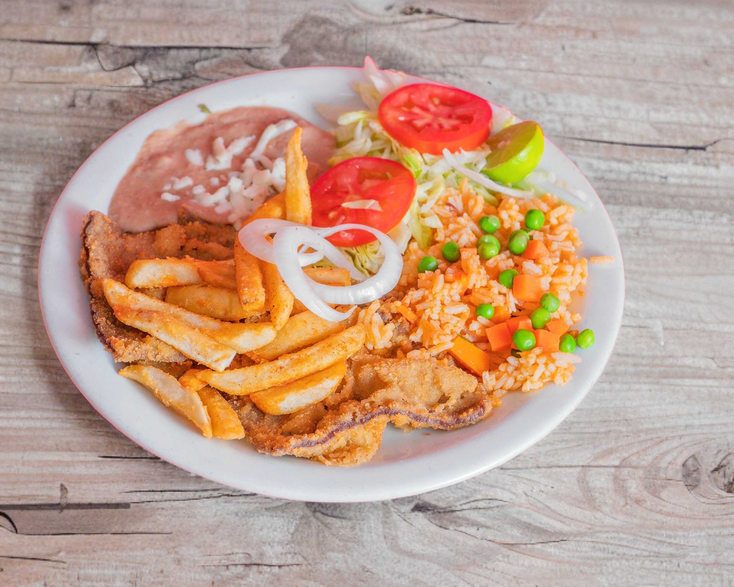Milanesa empanizado, con lechuga y tomate. Incluye papa francesa y tortillas