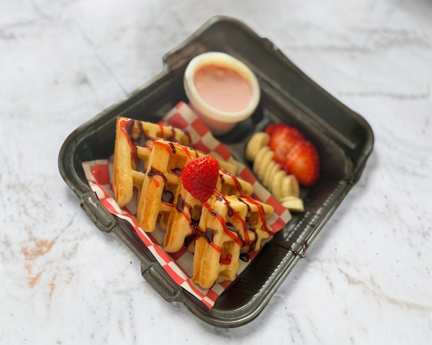 Wafle dorado y esponjoso, coronado con fresas y mango, bañado n irresistibles lineas de nutella