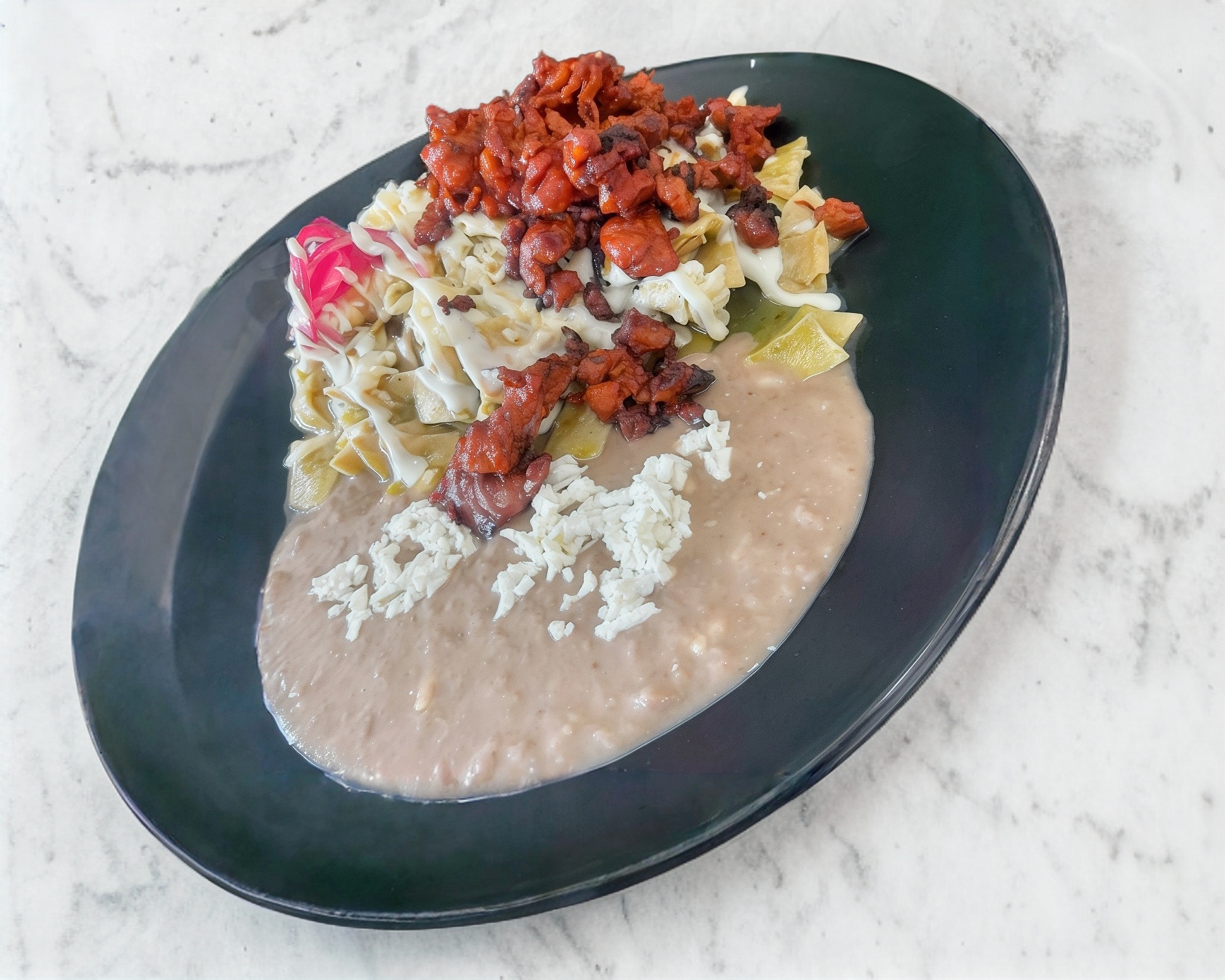 Crujientes totopos bañados en una salsa llena de sabor, coronados con crema, queso y una rica porción de trompo marinado, toda una tradición de sabor.