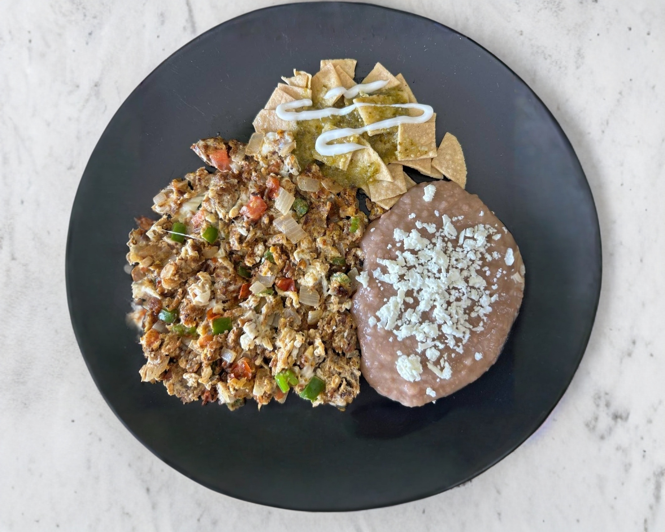 Huevos revueltos con machacada de res tia lencha, sazonado con pico de gallo y especias, acompañado de frijoles refritos con queso fresco, porción de chilaquiles y tortillas.