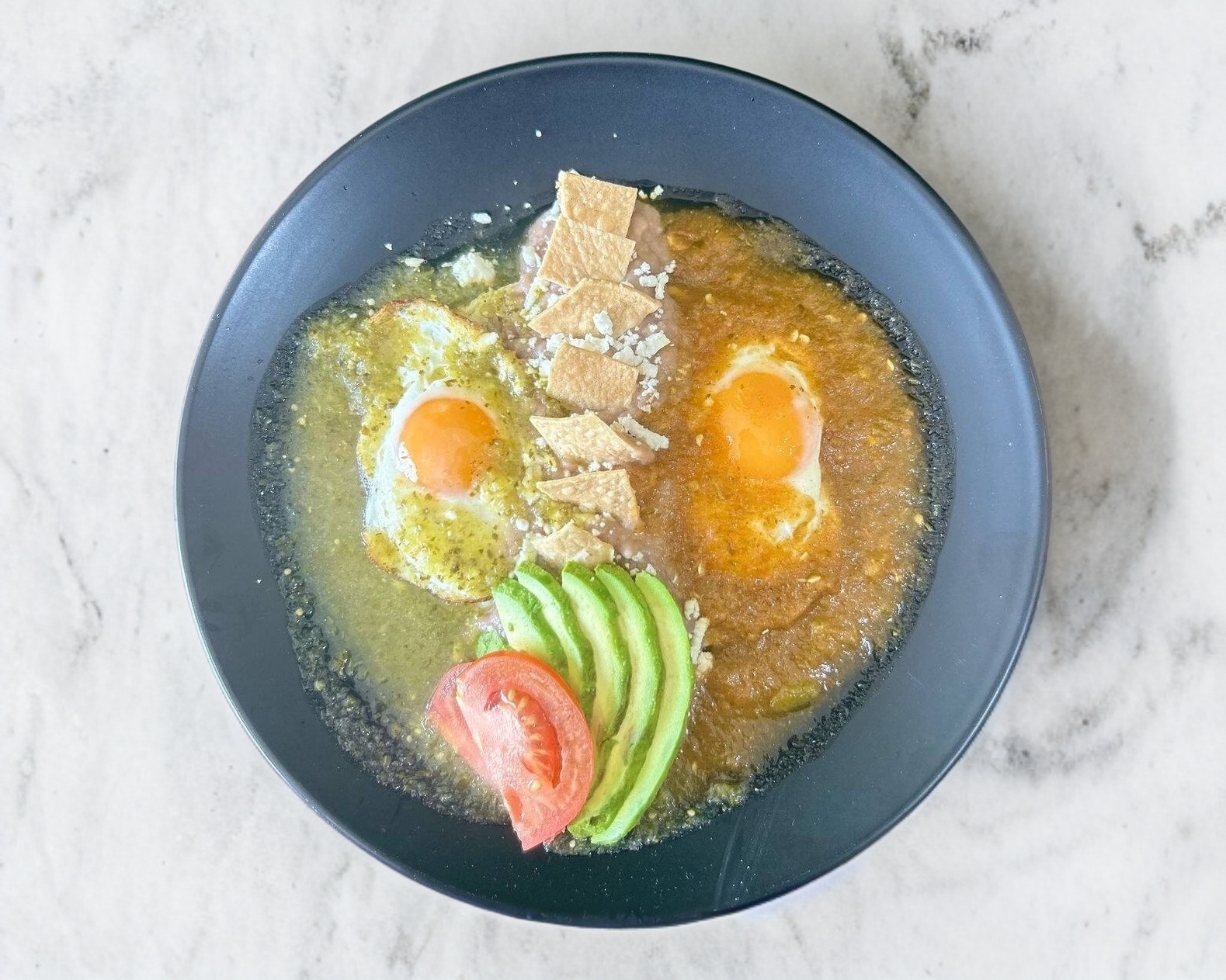 Huevos fritos bañados en salsa tradicional verde y roja, con una franja de frijoles refritos con totopos, queso fresco, vegetales y tortillas de maíz.