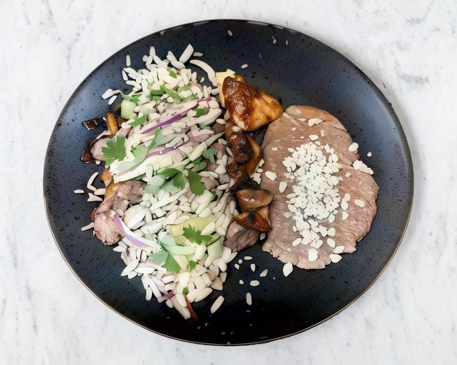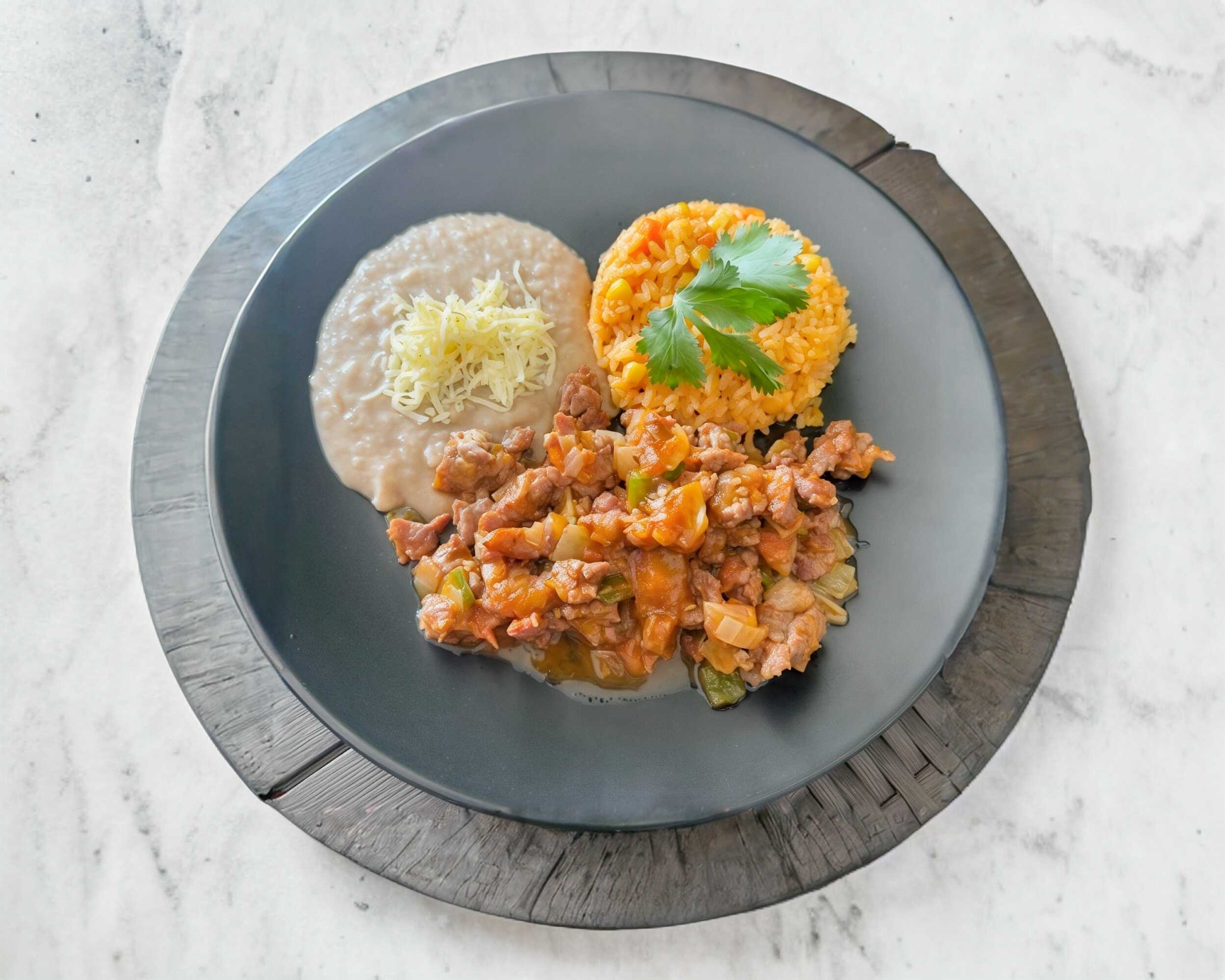 Mezcla jugosa y llena de sabor de carne, pimientos, cebolla salteados, se acompaña de arroz, frijol y tortillas