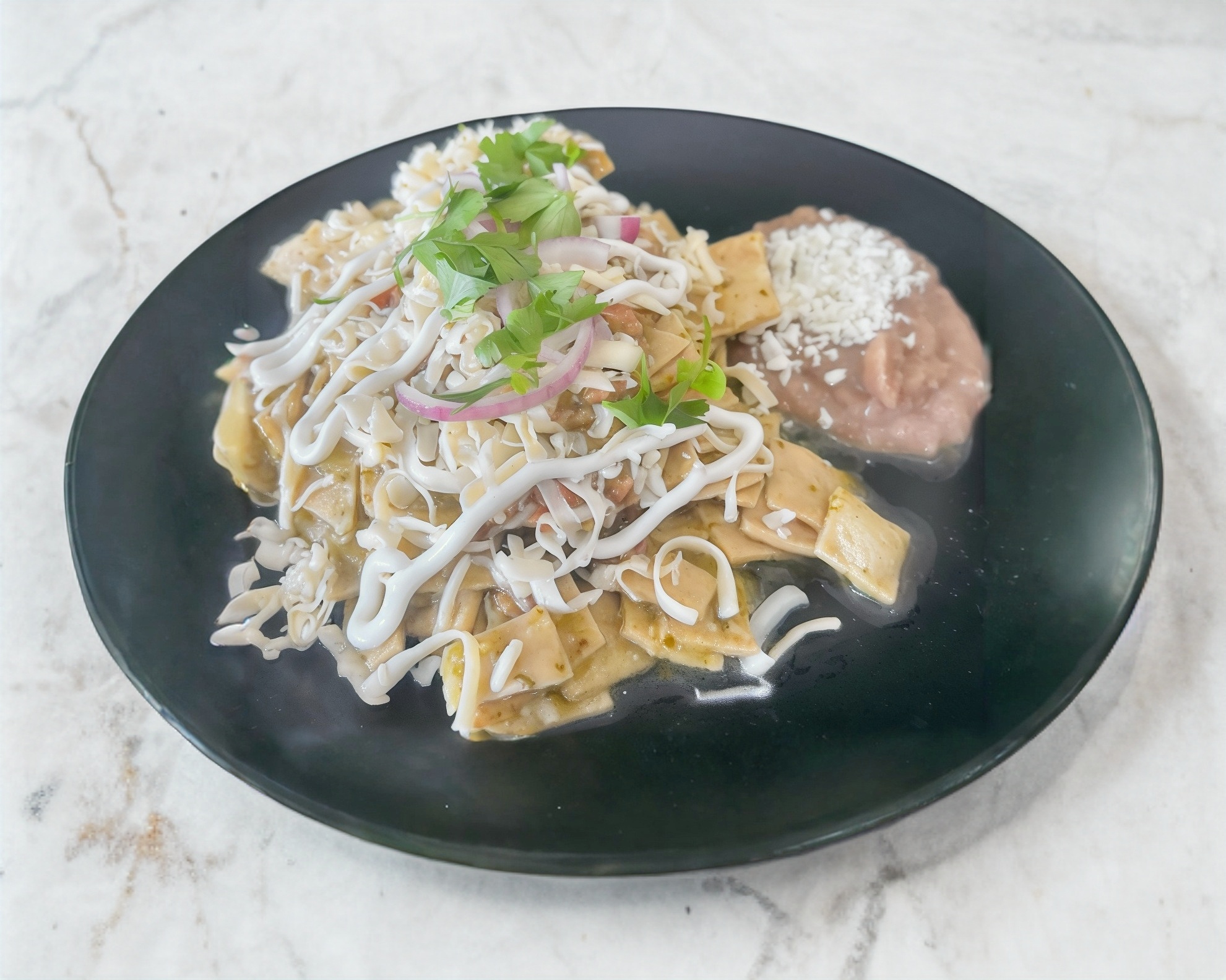 Crujientes totopos bañados en una salsa llena de sabor, coronados con crema, queso y pechuga de pollo a la plancha, toda una tradición de sabor.