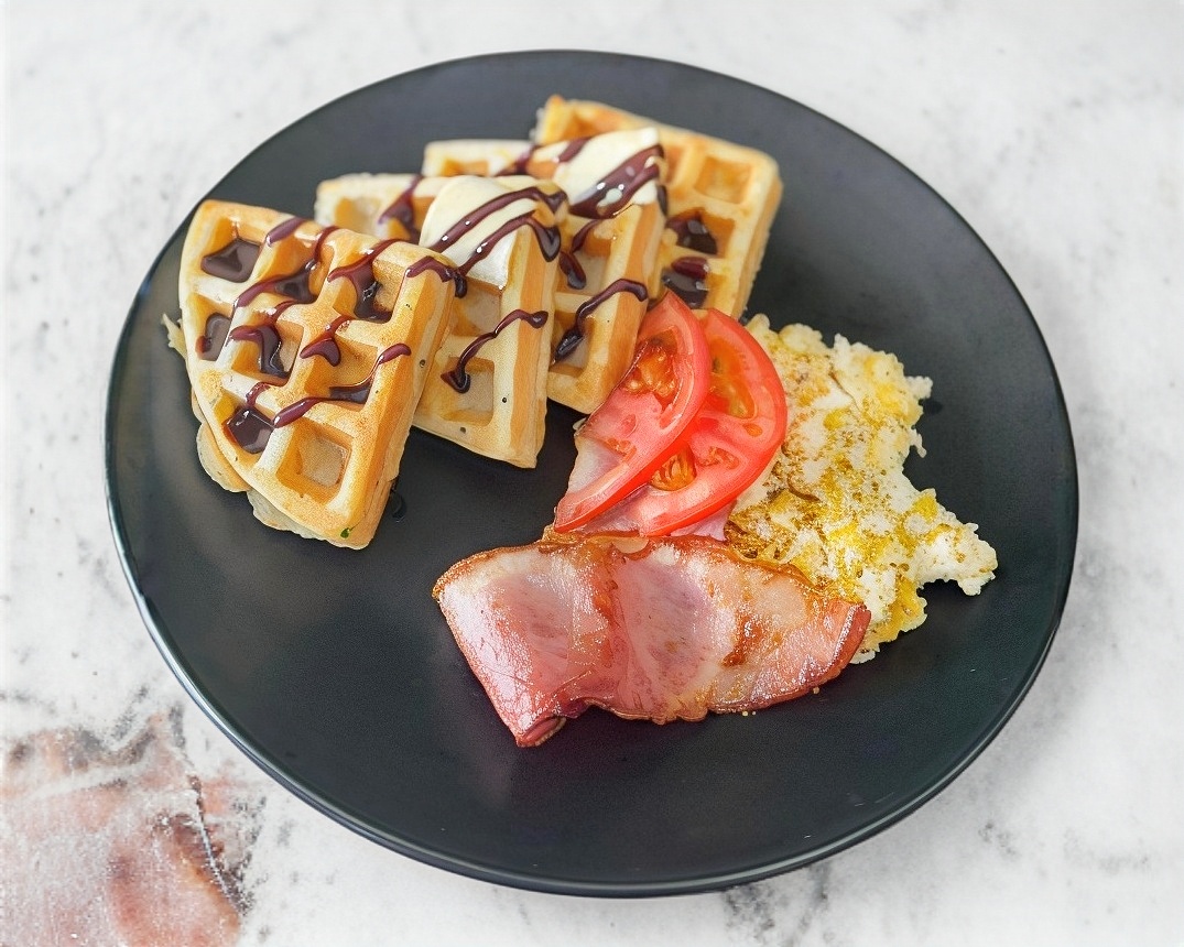 Suave y esponjoso waffle bañado en miel con un toque de mantequilla, acompañado de huevo revuelto con queso manchego y una rebanada de tocino dorado.