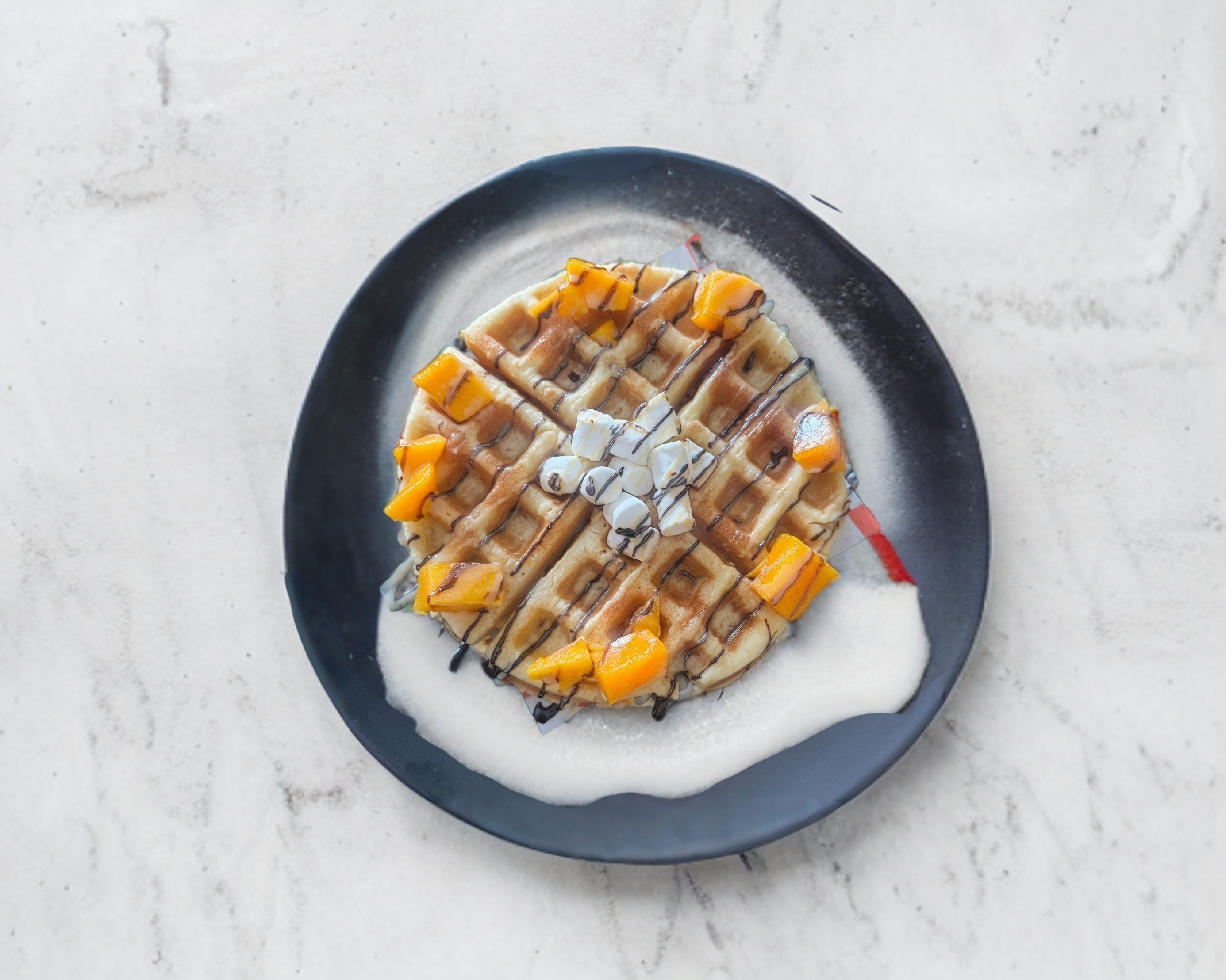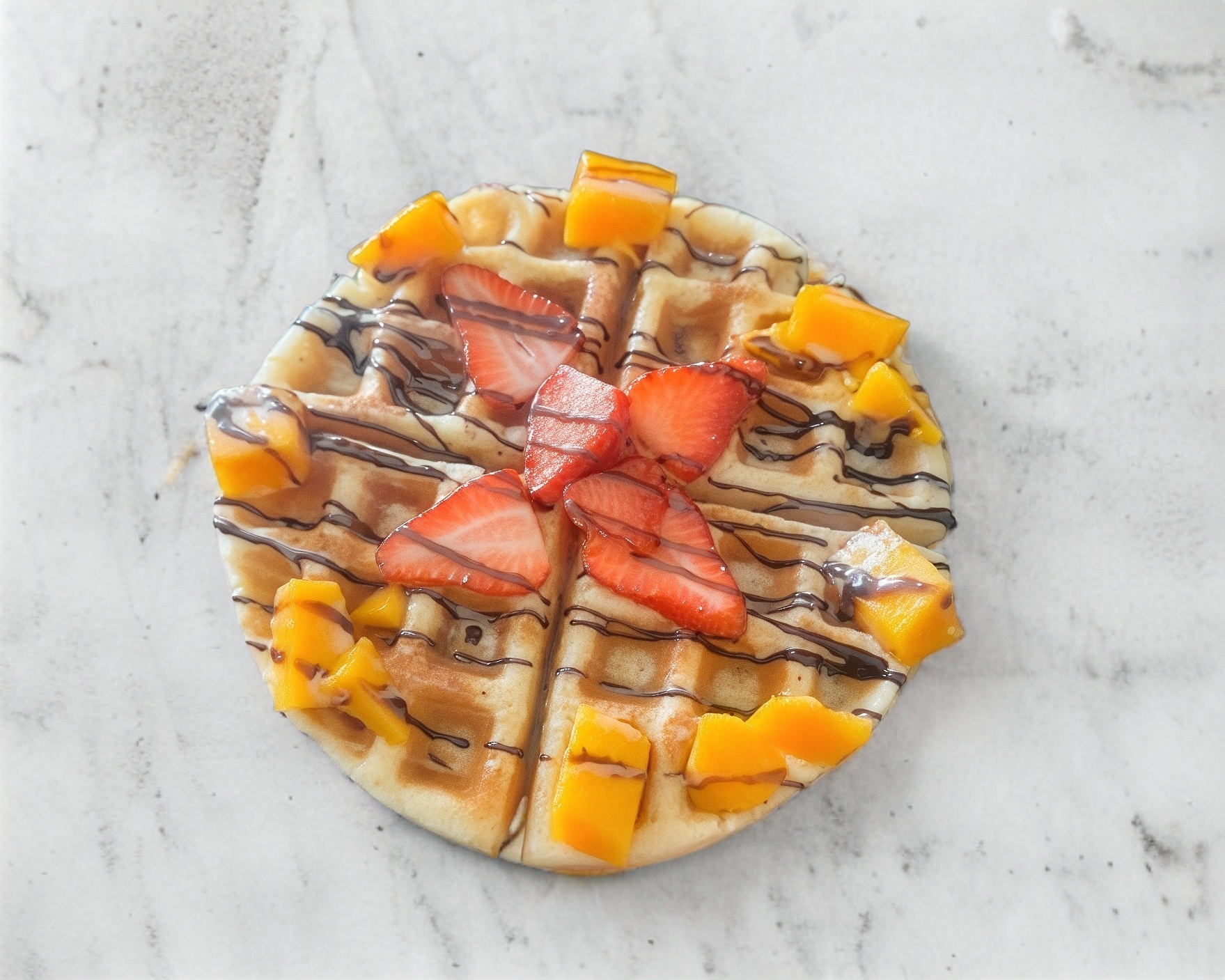 Wafle esponjoso con chispas de chocolate derretidas en su interior, decorados con jugosos reops de mango, suaves bombones y un toque de lineas de chocolate