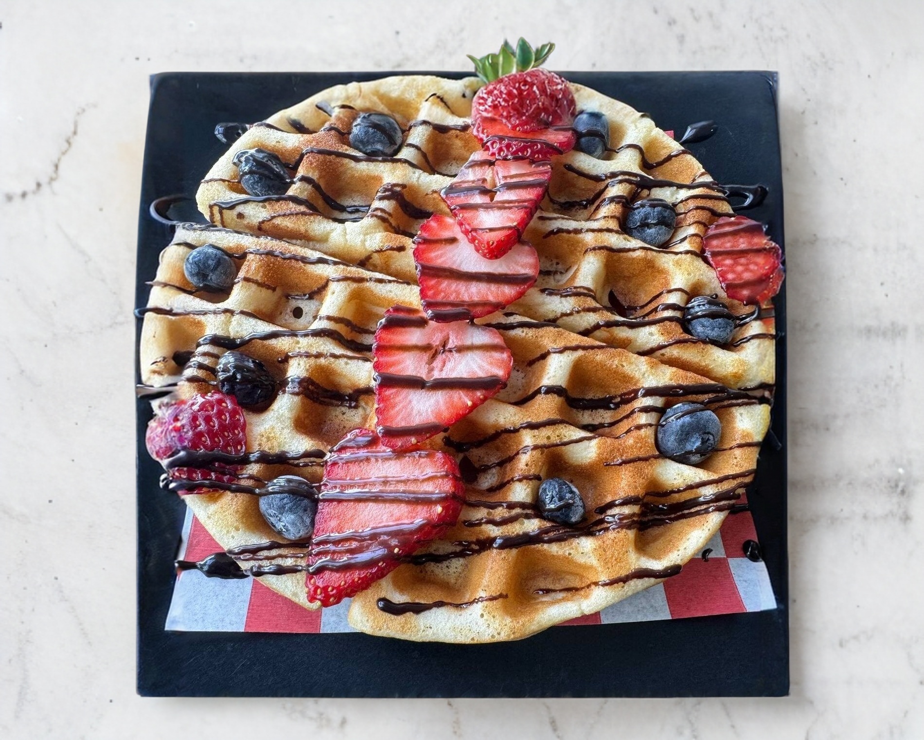 Wafle dorado y esponjoso, cubierto con jugosas blueberries y fresas, bañado con chocolate