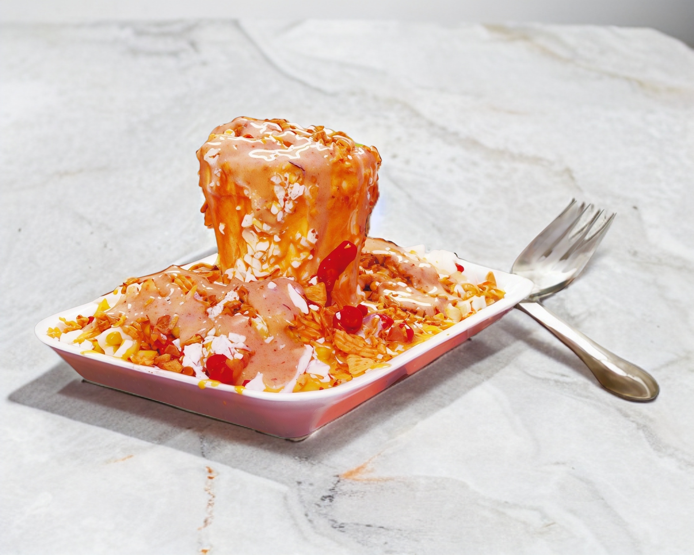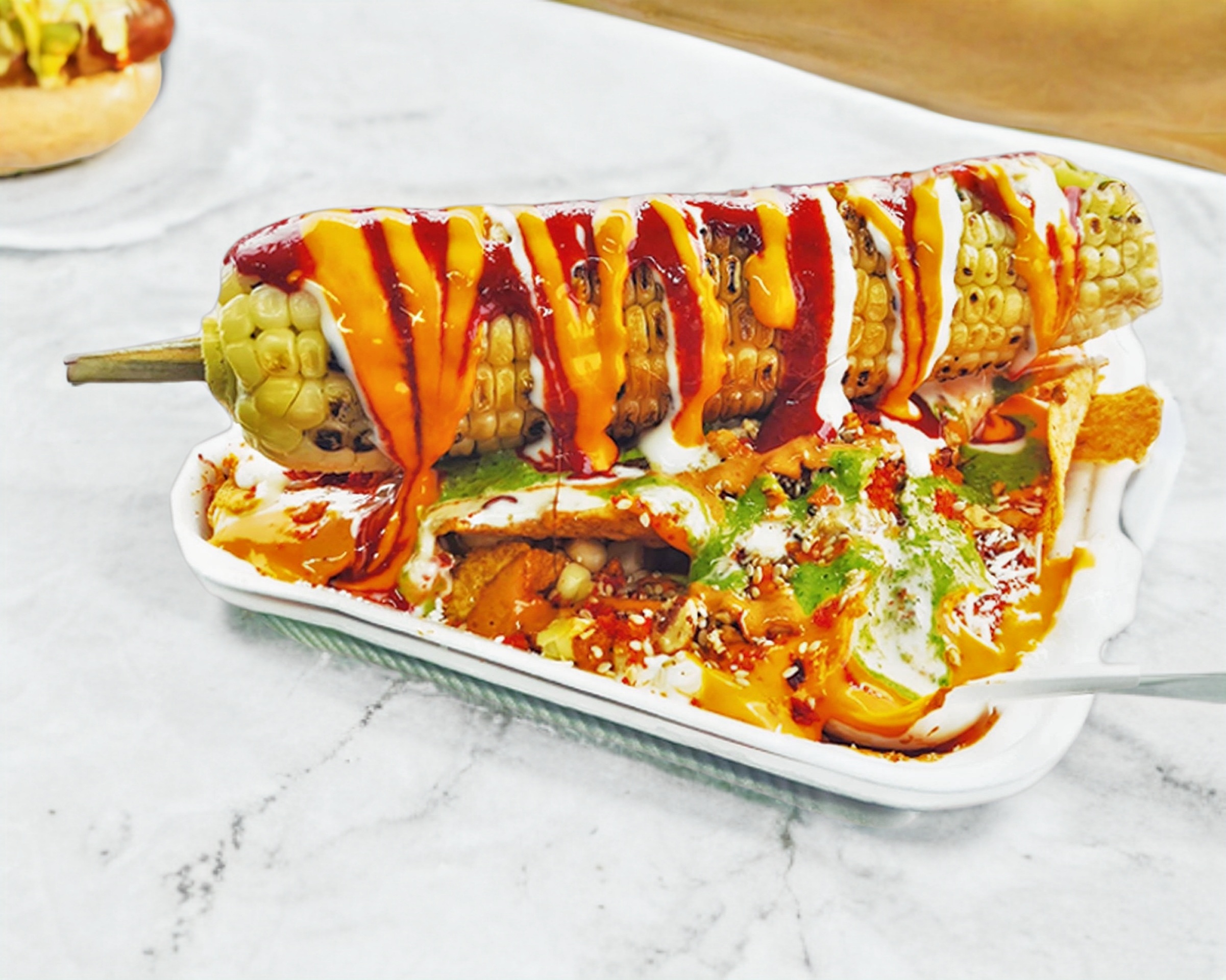Charola con elote desgranado y se colocan papas a su elección como: Tostitos, Conchitas, Tostileo, Ruffles, Doritos, Cheetos Flamin hot o Takis fuego y también se puede elegir con un elote entero arriba.