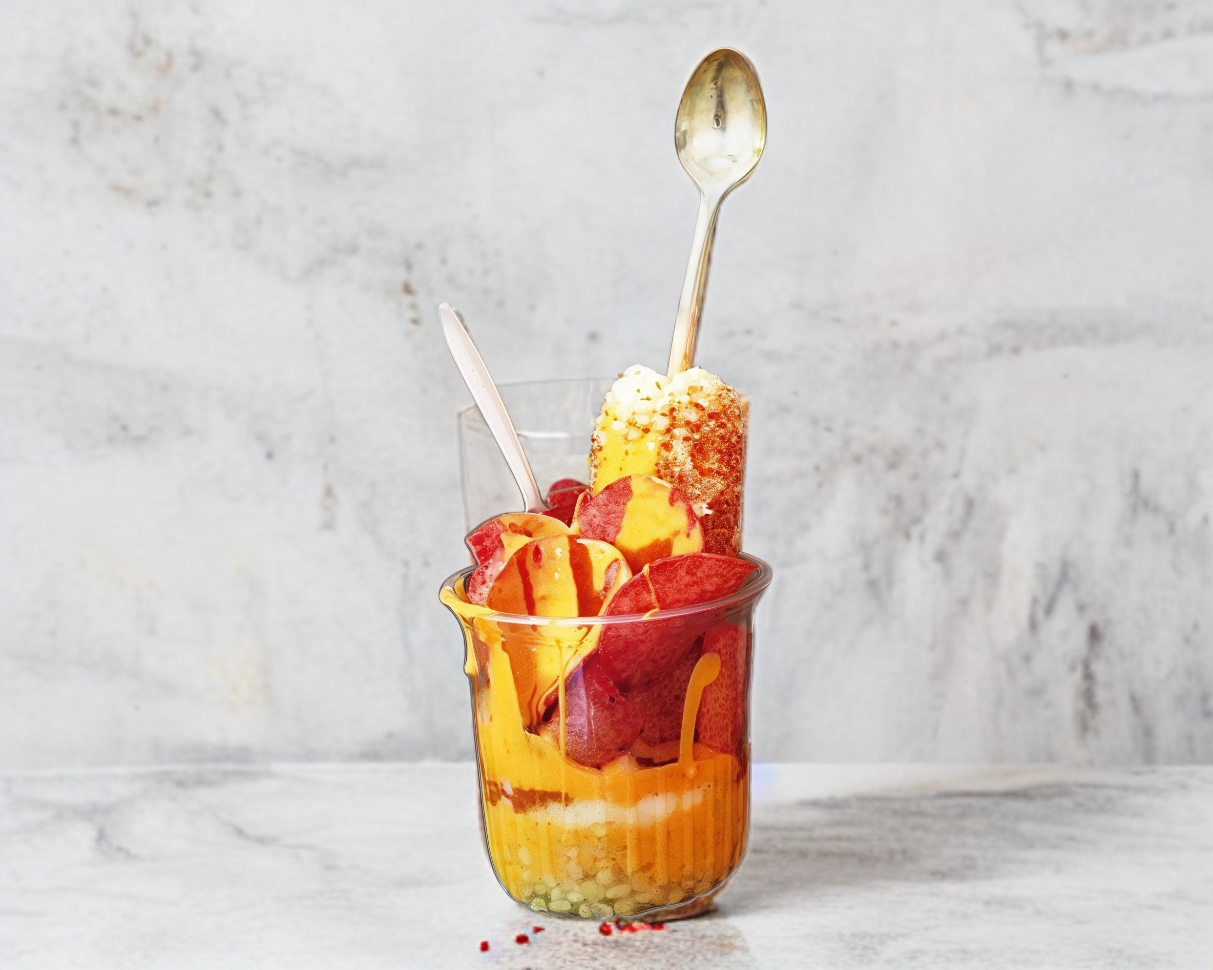 Elote desgranado en vaso y se coloca arriba de un plato que contiene más elote desgranado con Tostitos molidos en la parte de arriba.