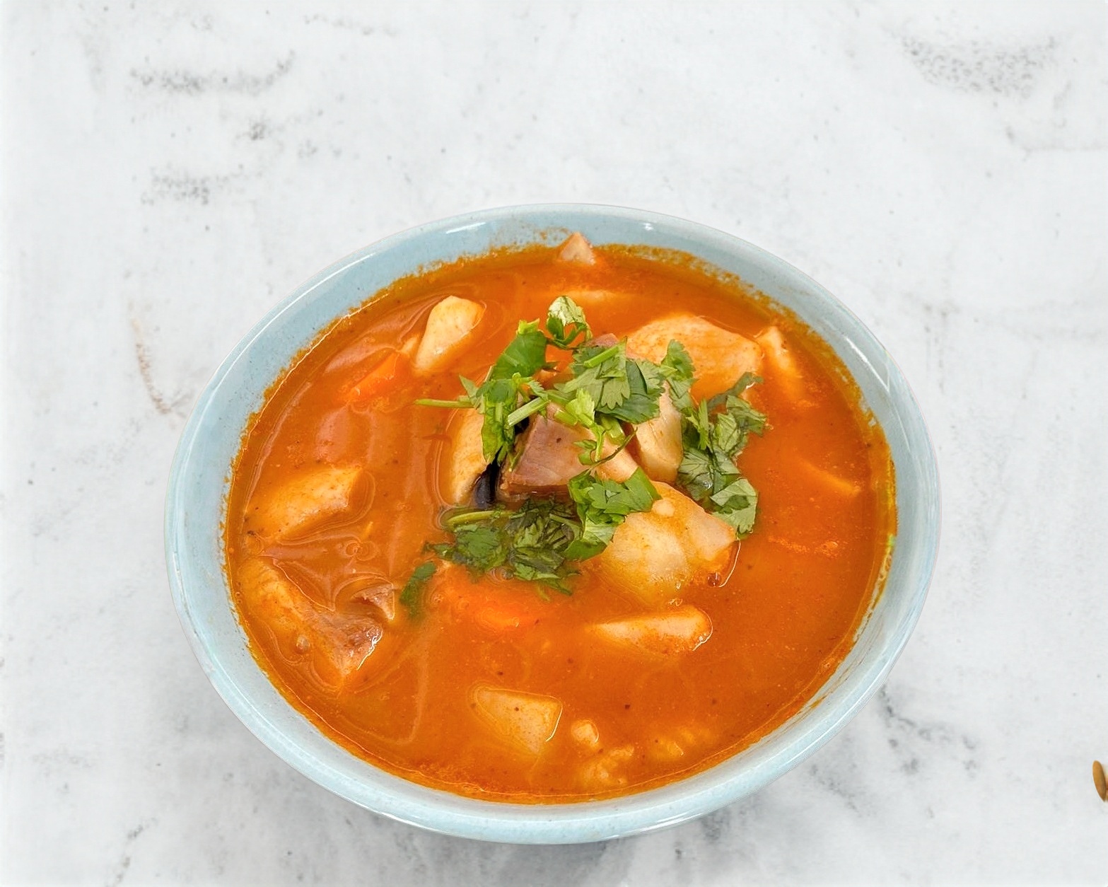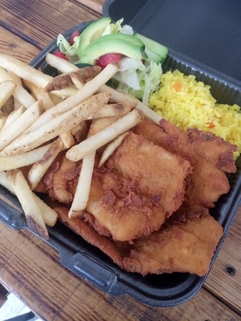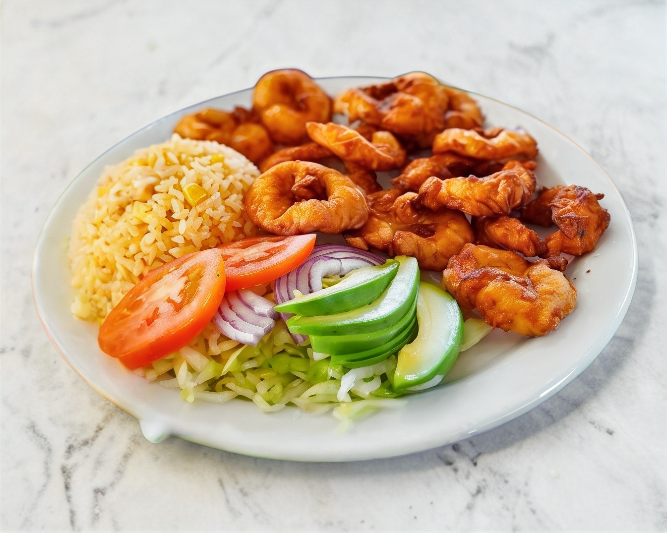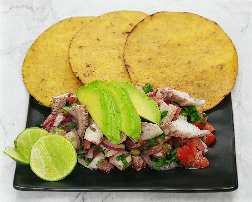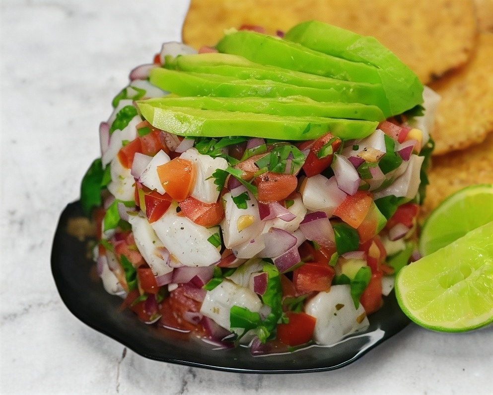 Filete de pescado marinado en limón y especias con aguacate, tómate, cilantro y cebolla morada.