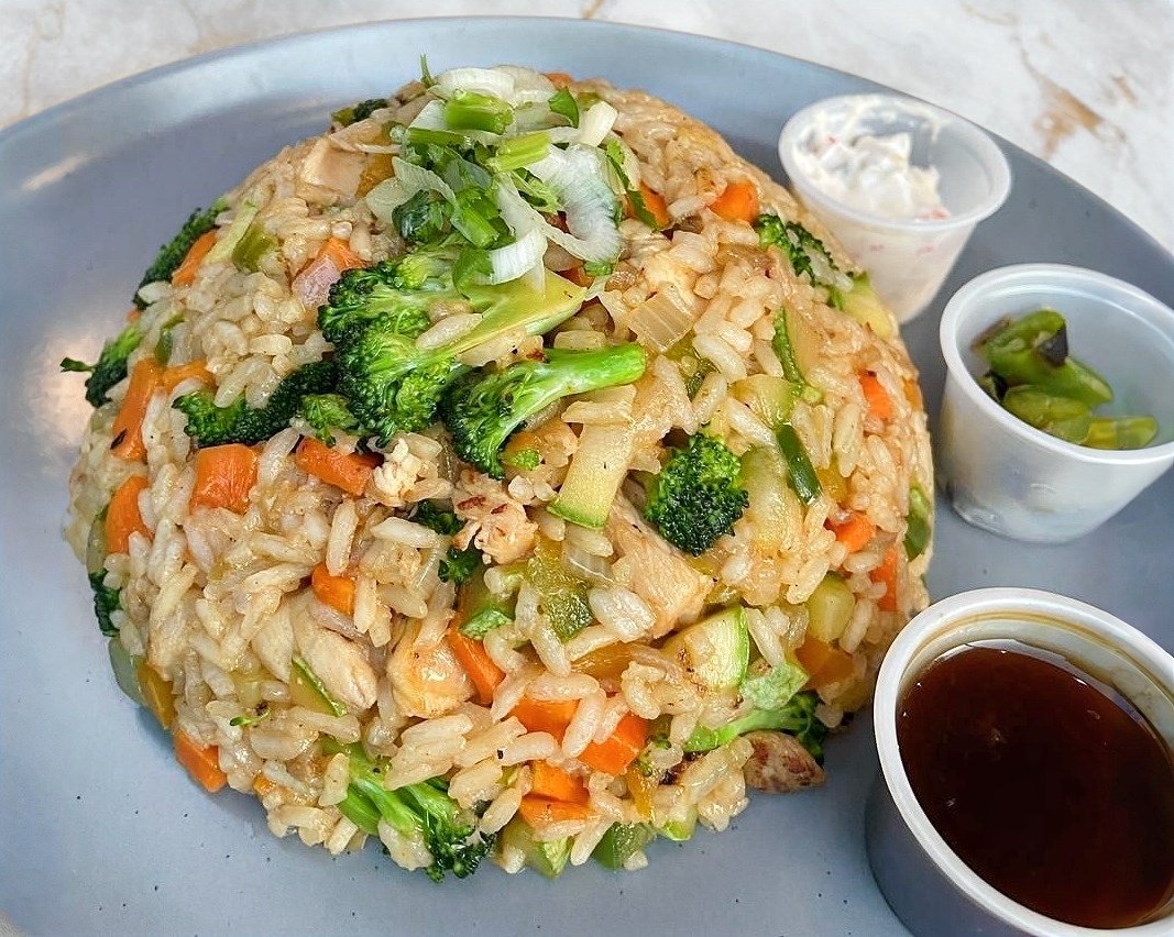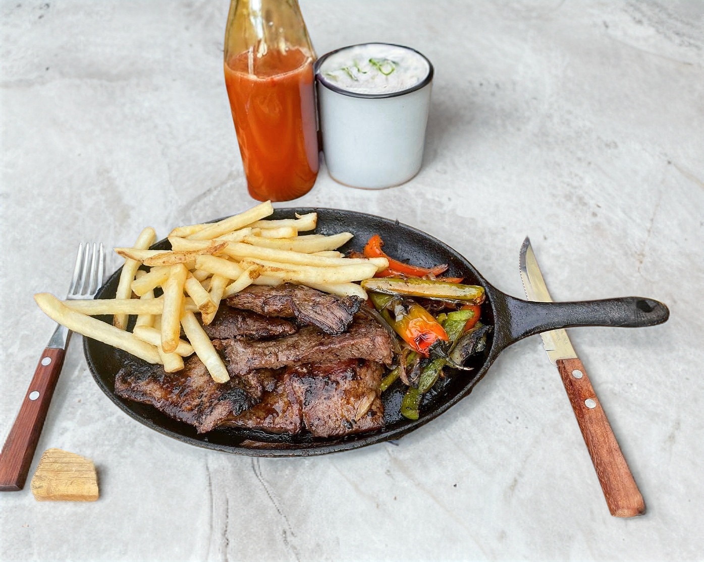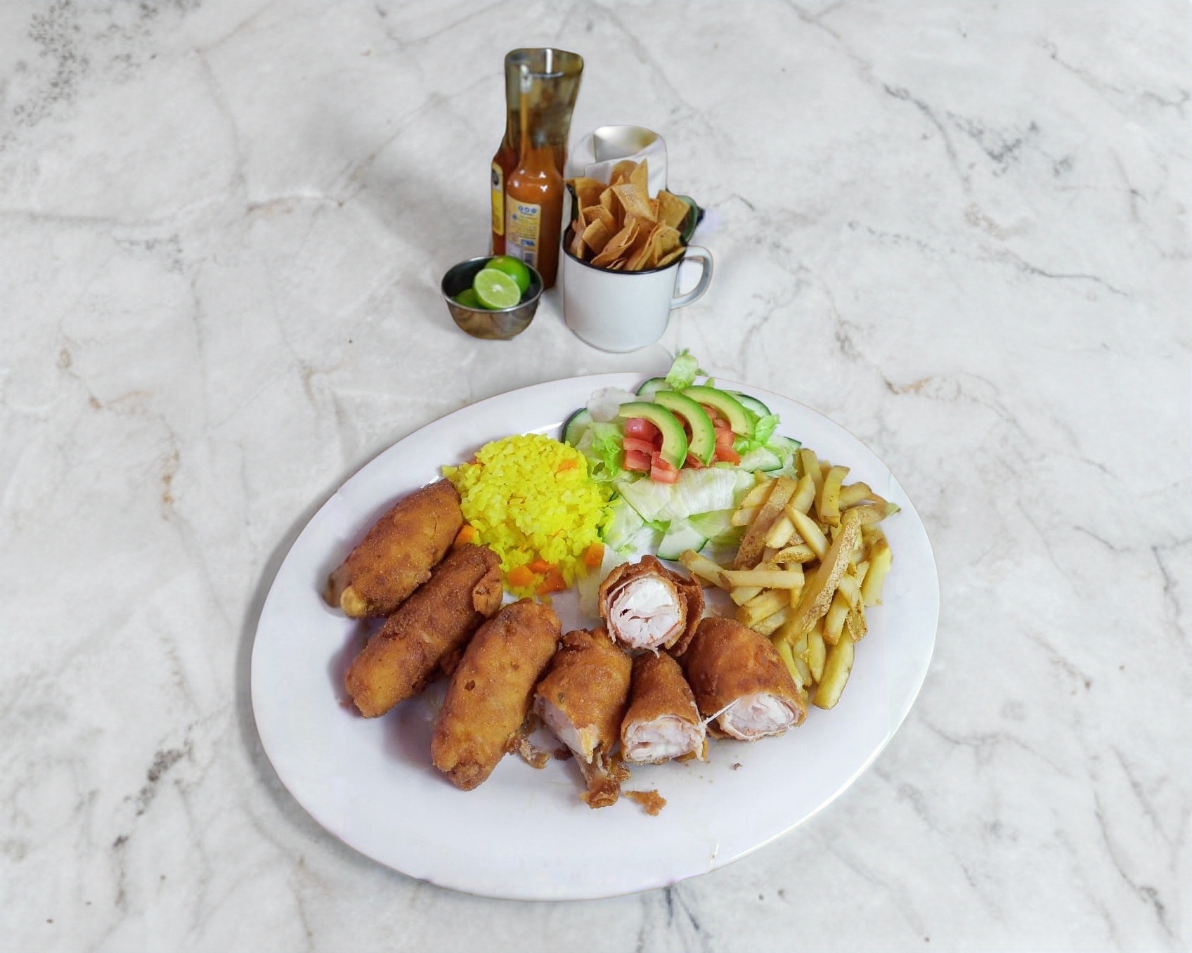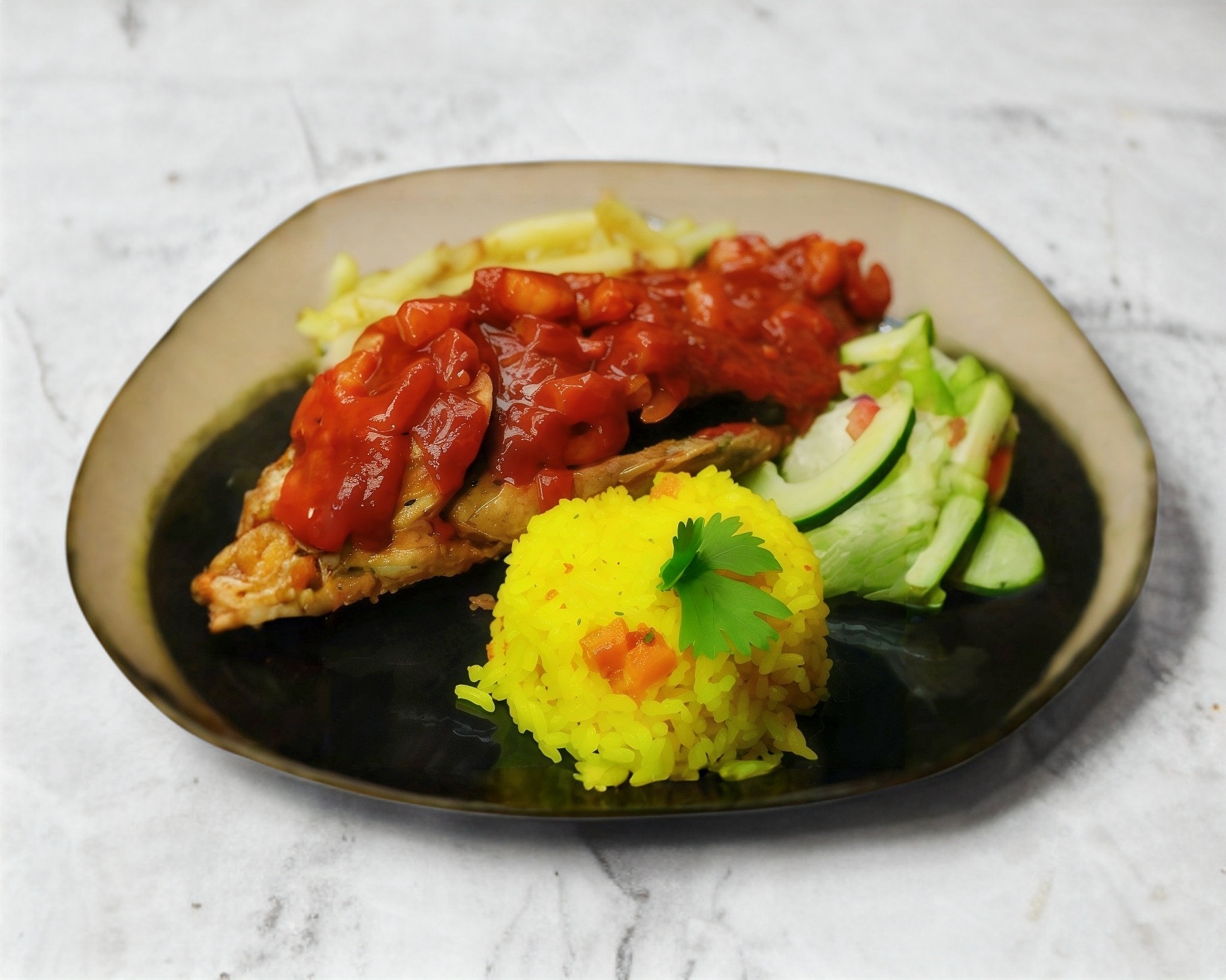 Filete de pescado marinado en limón y especias con aguacate, tómate, cilantro y cebolla morada.