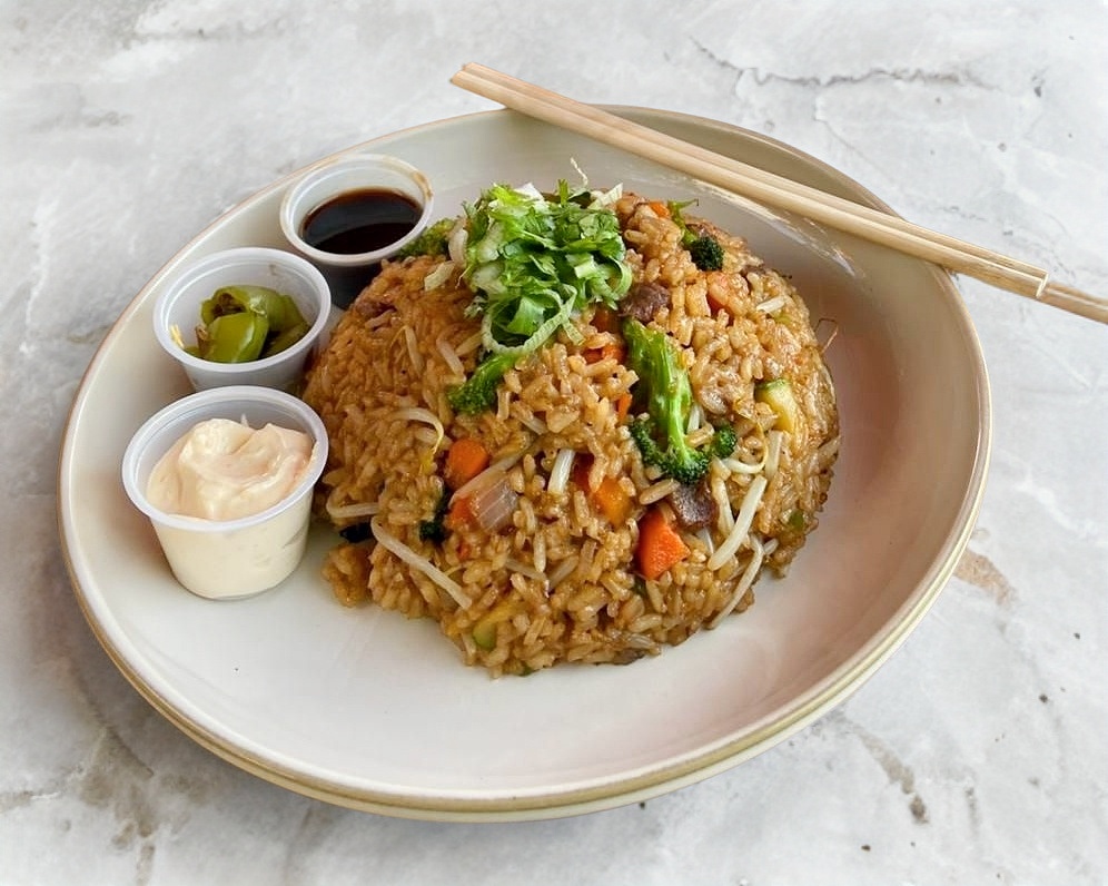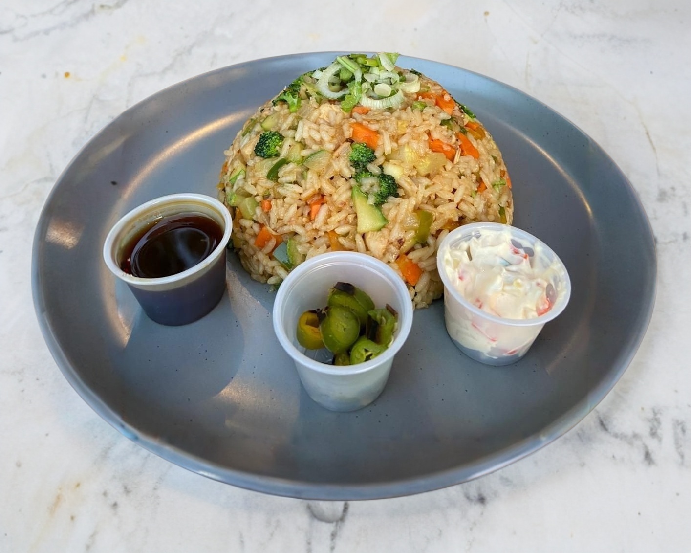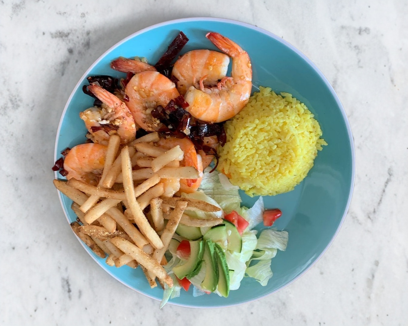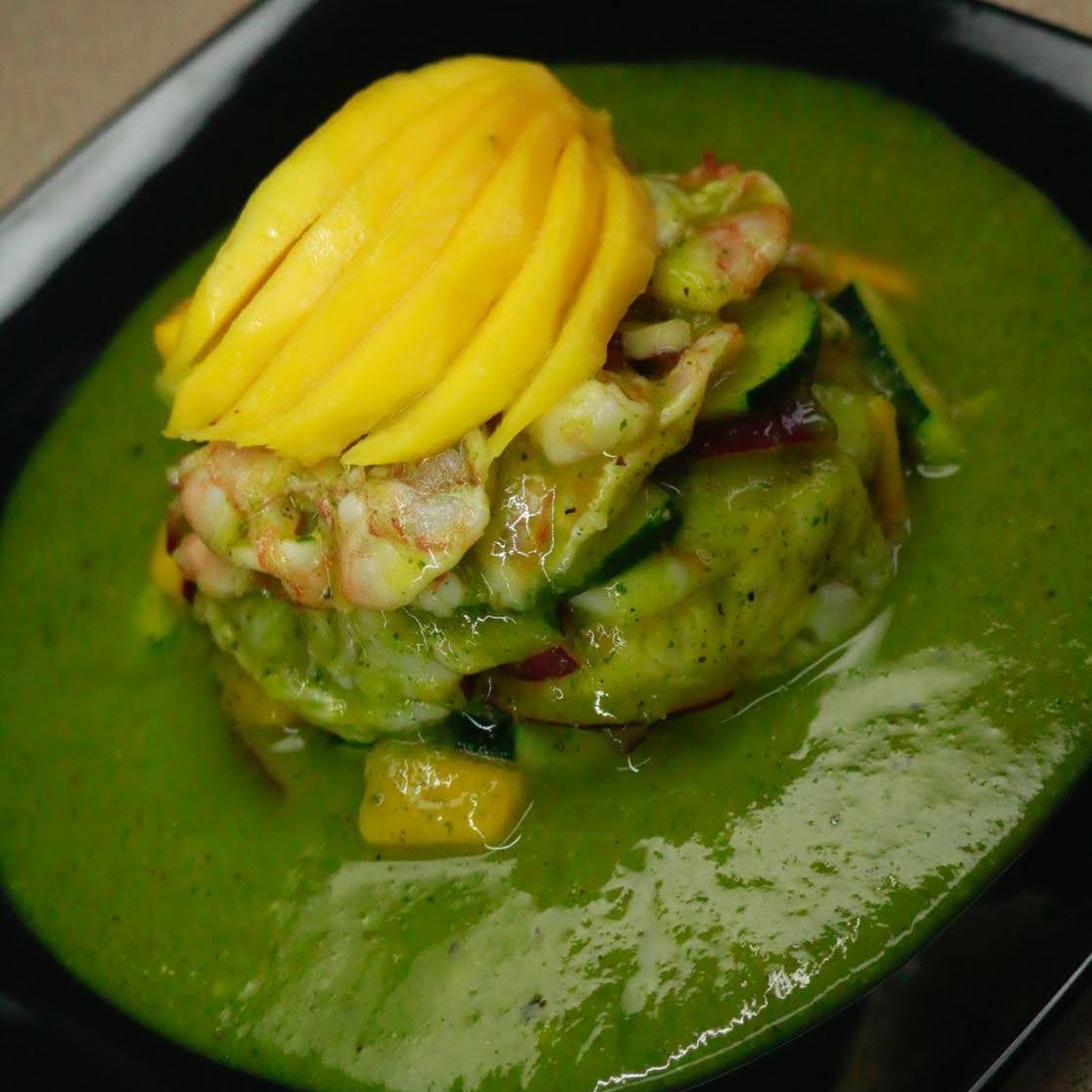 Camarón gris con pepino, cebolla morada y mango en salsa de mango habanero.
