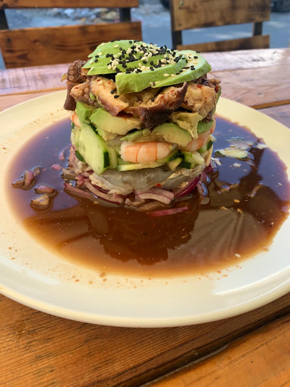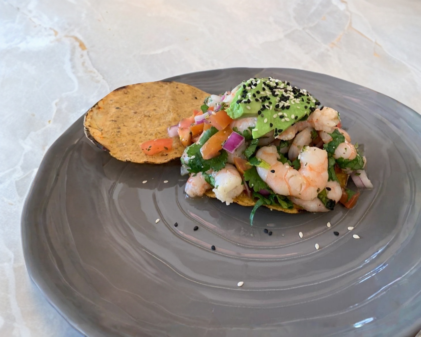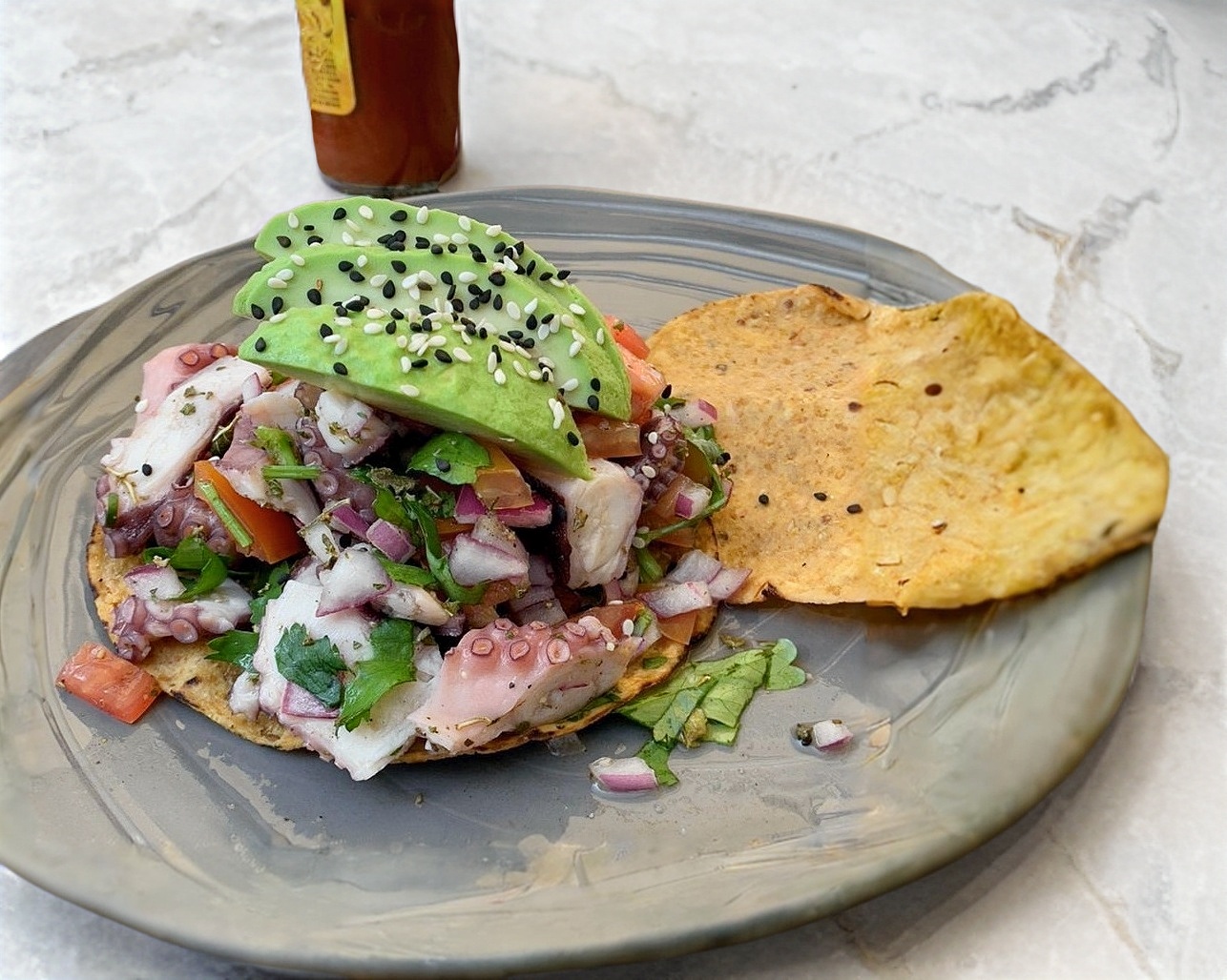 Camarón con pulpo en salsa de la casa, aguacate,tomate y cebolla morada se acompaña con totopos , salsa de habanero y aderezo de la casa