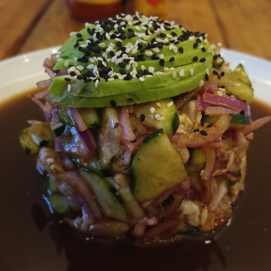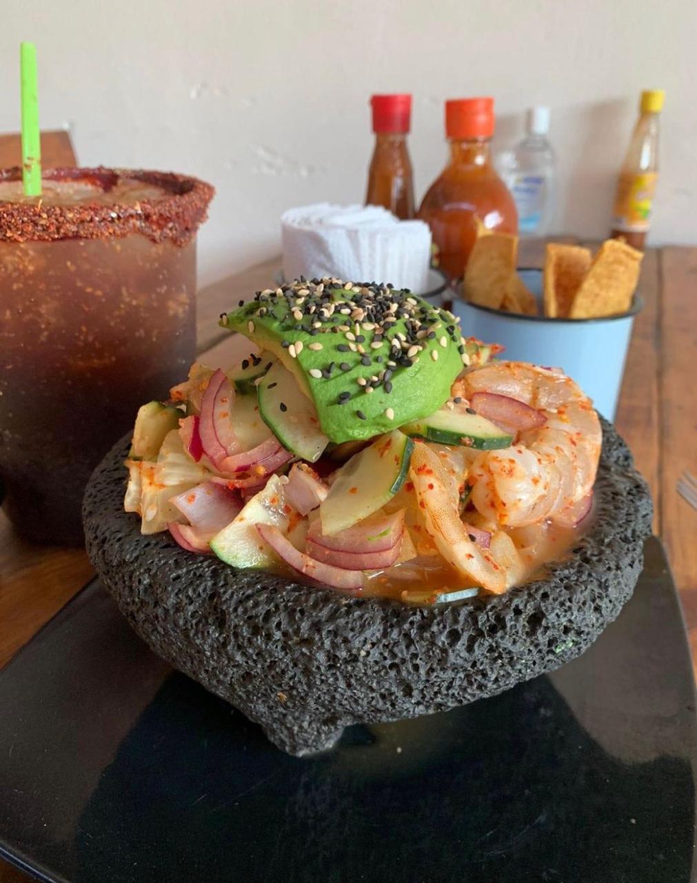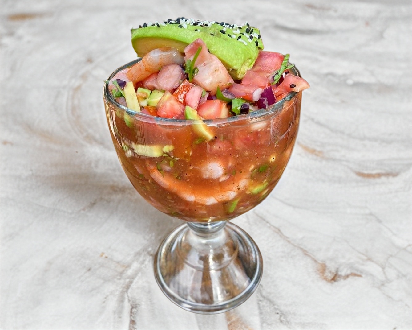 Camarón con pulpo en salsa de la casa, aguacate,tomate y cebolla morada se acompaña con totopos , salsa de habanero y aderezo de la casa