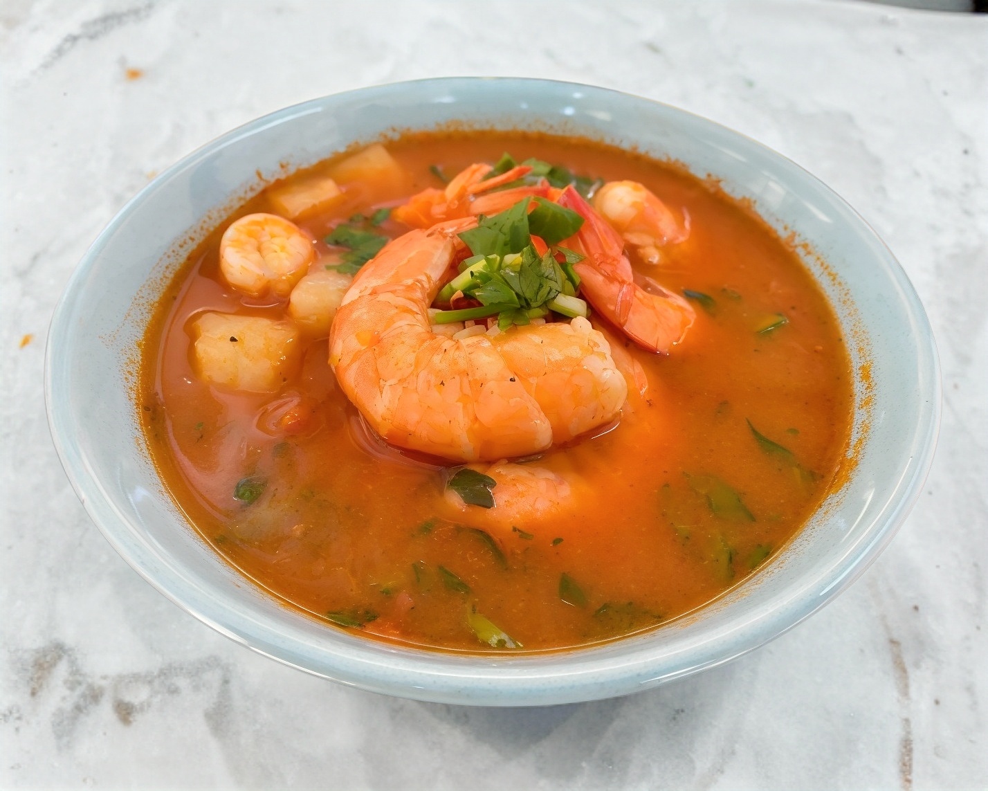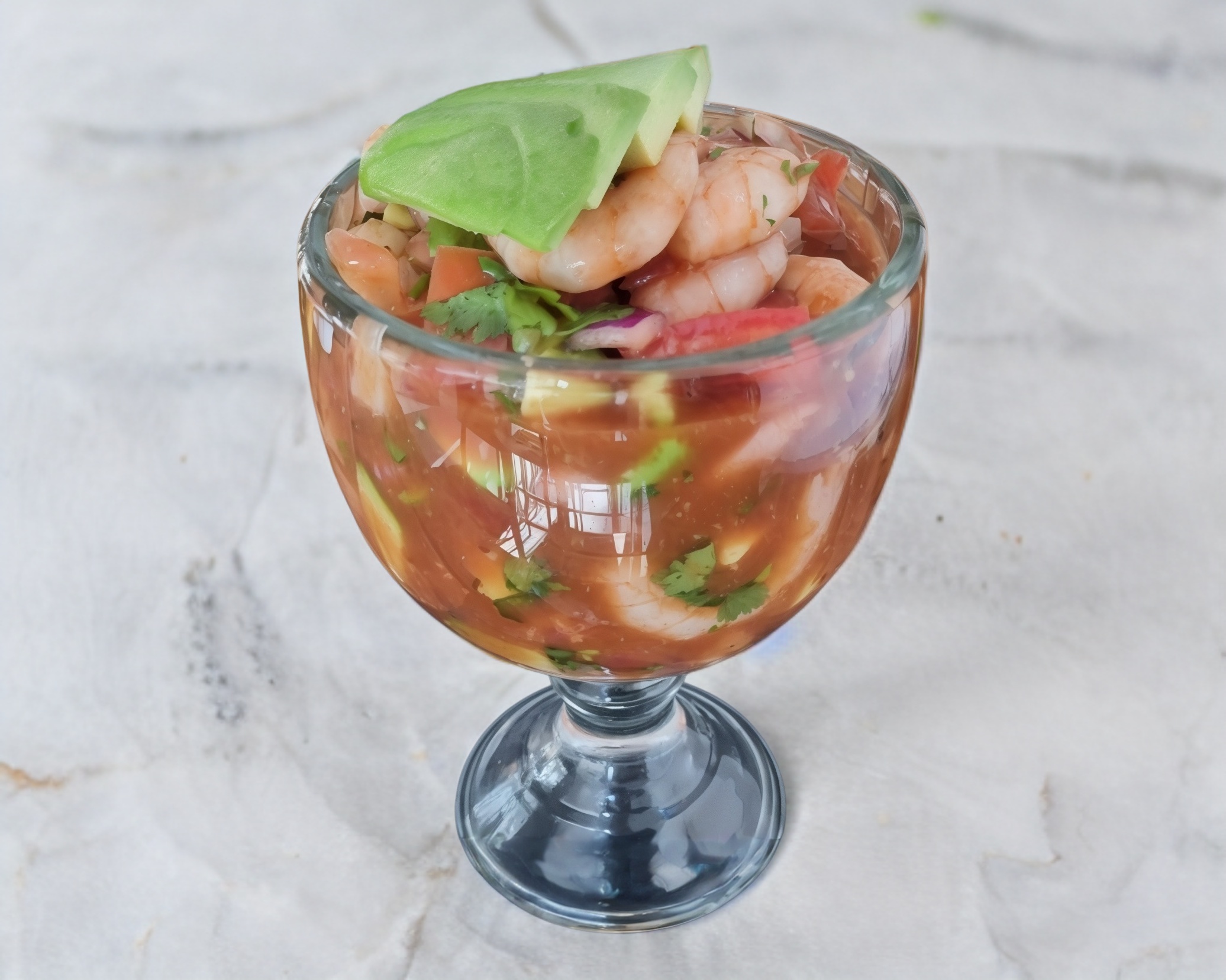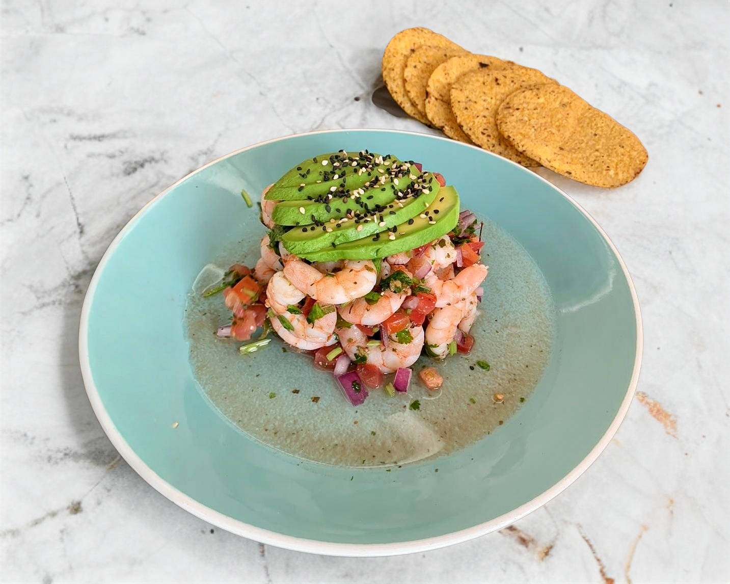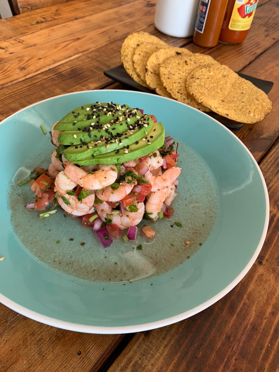 Camarónes en alsa de tomate de la casa con aguacate, tomate, cilantro, cebolla morada se acompaña con totopos salsa de habanero y aderezo de la casa