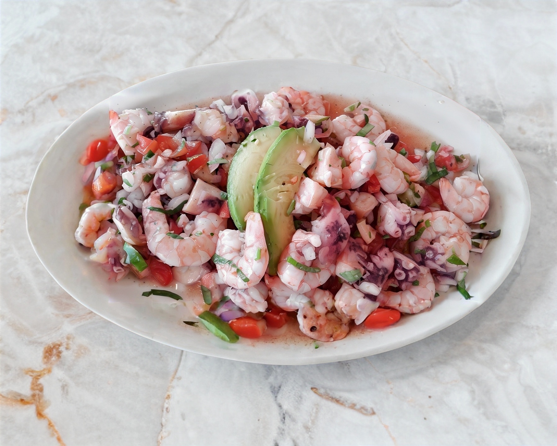 Mezcla de mariscos en limón. Aguacate, tomate, cebolla morada, y cilantro.