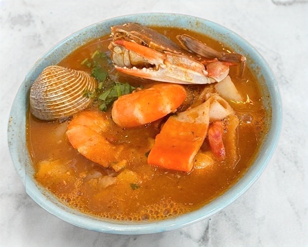 Pulpo y camarones en una mezcla de mariscos frescos.