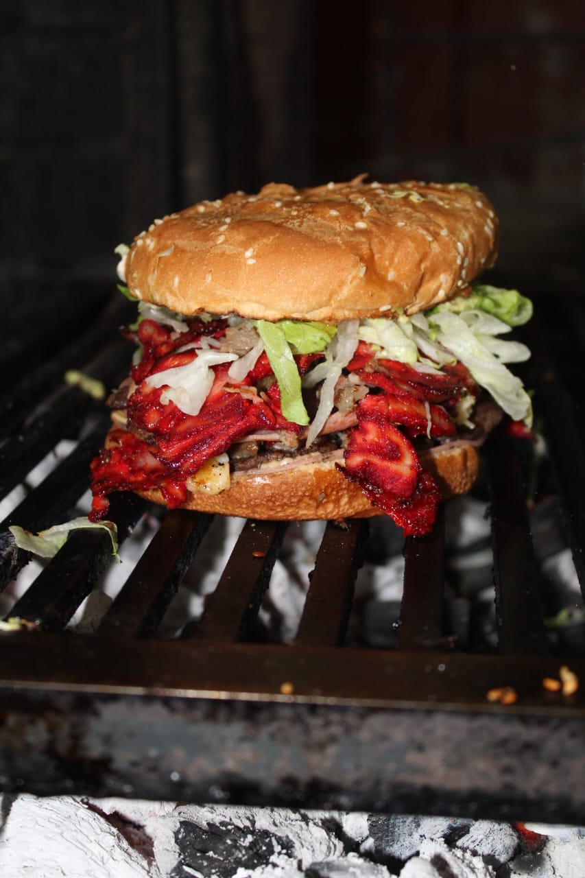 Hamburguesa con carne,lechuga,aguacate, cebolla, queso, jamón y piña.
