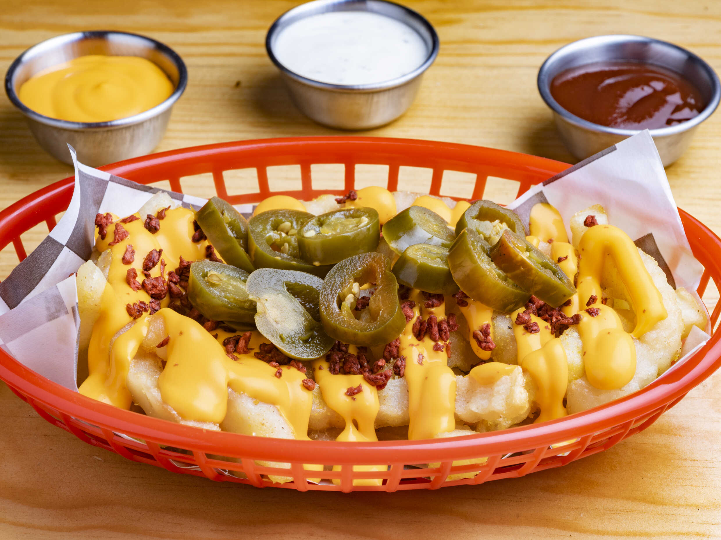 ORDEN DE PAPAS FRITAS CON QUESO AMARILLO BITS DE TOCINO Y JALAPEÑOS